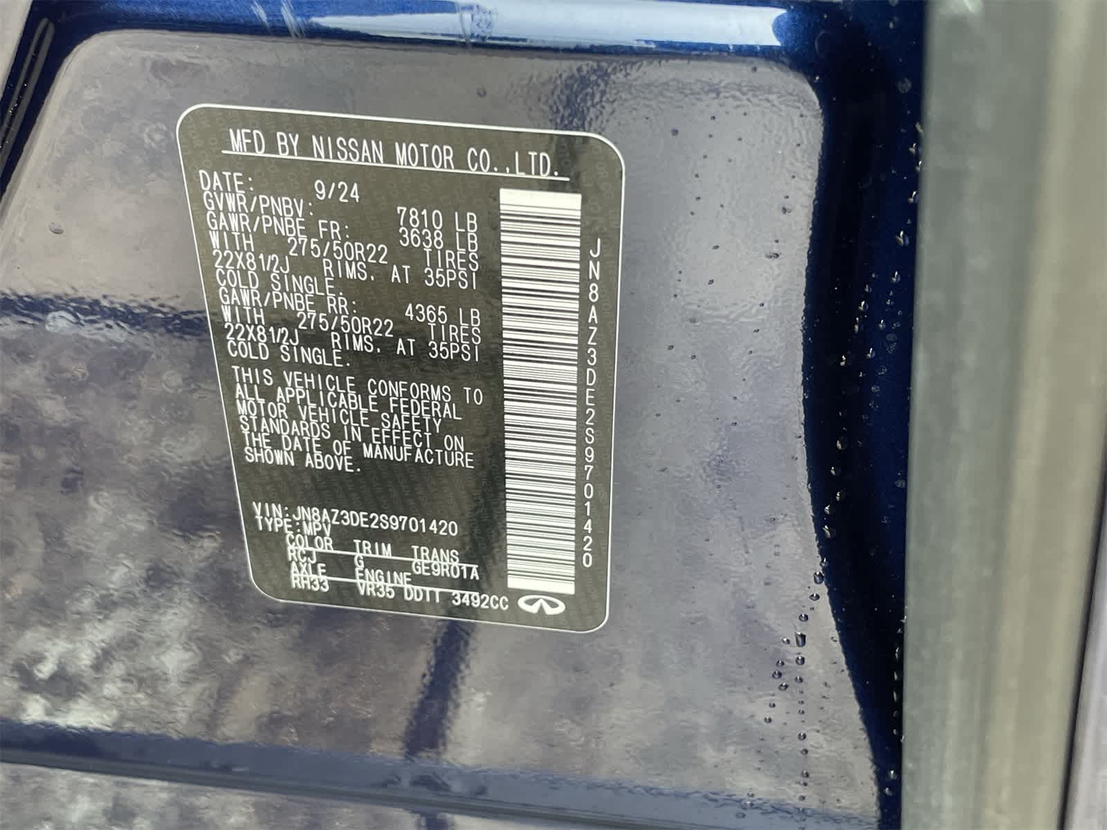 Grand Blue 2025 INFINITI QX80 SENSORY 4WD 9-Speed Automatic 3.5L V6 DOHC 24V 3rd row seats: bench, 4-Wheel Disc Brakes, ABS brakes, Adaptive suspension, Air Conditioning, Alloy wheels, AM/FM radio: SiriusXM with 360L, Anti-whiplash front head restraints, Apple CarPlay/Android Auto, Audio memory, Auto High-beam Headlights, Auto tilt-away steering wheel, Auto-dimming door mirrors, Auto-dimming Rear-View mirror, Auto-leveling suspension, Automatic temperature control, Brake assist, Bumpers: body-color, Center Front Spoiler, Climate Controlled Front Bucket Seats w/Massage, Compass, Delay-off headlights, Driver door bin, Driver vanity mirror, Dual front impact airbags, Dual front side impact airbags, Electronic Stability Control, Emergency communication system: INFINITI InTouch, Exterior Package, Four wheel independent suspension, Front anti-roll bar, Front Bucket Seats, Front Center Armrest, Front dual zone A/C, Front reading lights, Fully automatic headlights, Garage door transmitter: myQ Connected Garage, Genuine wood dashboard insert, Genuine wood door panel insert, Heads-Up Display, Heated door mirrors, Heated front seats, Heated rear seats, Heated steering wheel, HVAC memory, Illuminated entry, INFINITI Radiant Silver Cargo Scuff Plates, Knee airbag, Leather steering wheel, Literature Kit, Low tire pressure warning, Matte Chrome Rear Bumper Protector, Memory seat, Navigation system: Google Built-in, Occupant sensing airbag, Outside temperature display, Overhead airbag, Overhead console, Panic alarm, Panoramic Illuminated Headliner, Passenger door bin, Passenger vanity mirror, Power door mirrors, Power driver seat, Power Liftgate, Power moonroof, Power passenger seat, Power steering, Power windows, Premium Paint, ProPILOT Assist 2.1 (SENSORY Grade), Radio data system, Radio: Klipsch Reference Premiere Audio System, Rain sensing wipers, Rear air conditioning, Rear anti-roll bar, Rear reading lights, Rear seat center armrest, Rear window defroster, Rear window wiper, Reclining 3rd row seat, Remote keyless entry, Security system, Semi-Aniline Premium Leather Seating Surfaces, Silver Cross Bars, Silver Interior Lighting Package, Speed control, Speed-sensing steering, Splash Guards, Split Bench Seat Package, Split folding rear seat, Spoiler, Steering wheel memory, Steering wheel mounted audio controls, Tachometer, Telescoping steering wheel, Tilt steering wheel, Traction control, Trip computer, Turn signal indicator mirrors, Umbrella Holder, Variably intermittent wipers, Ventilated front seats, Ventilated rear seats, Wheels: 22 x 8 Cast Aluminum Alloy.
