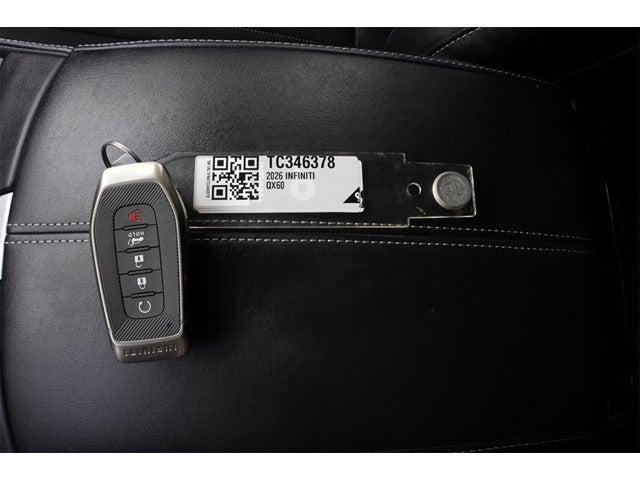 Mineral Black 2026 INFINITI QX60 LUXE FWD 9-Speed Automatic 2.0L I4 PDI Turbocharged DOHC 16V 268hp 16 Speakers, 3rd row seats: bench, 4-Wheel Disc Brakes, ABS brakes, Air Conditioning, Alloy wheels, AM/FM radio: SiriusXM with 360L, Anti-whiplash front head restraints, Apple CarPlay/Android Auto, Auto High-beam Headlights, Auto tilt-away steering wheel, Auto-dimming door mirrors, Auto-dimming Rear-View mirror, Automatic temperature control, Bose Performance Series 17-Speaker Sound System, Brake assist, Bumpers: body-color, Climate Controlled Front Bucket Seats, Delay-off headlights, Driver door bin, Driver vanity mirror, Dual front impact airbags, Dual front side impact airbags, Electronic Stability Control, Emergency communication system: INFINITI InTouch, Four wheel independent suspension, Front anti-roll bar, Front Bucket Seats, Front Center Armrest, Front dual zone A/C, Front reading lights, Fully automatic headlights, Garage door transmitter: HomeLink, Heated door mirrors, Heated front seats, Heated rear seats, Heated steering wheel, Illuminated entry, Knee airbag, Leather Shift Knob, Leather steering wheel, Low tire pressure warning, Memory seat, Navigation system: Google Built-in, Occupant sensing airbag, Outside temperature display, Overhead airbag, Overhead console, Panic alarm, Passenger door bin, Passenger vanity mirror, Power door mirrors, Power driver seat, Power Liftgate, Power moonroof: Panoramic, Power passenger seat, Power steering, Power windows, Radio data system, Radio: Klipsch Premium Audio System, Rain sensing wipers, Rear air conditioning, Rear anti-roll bar, Rear reading lights, Rear seat center armrest, Rear side impact airbag, Rear window defroster, Rear window wiper, Reclining 3rd row seat, Remote keyless entry, Security system, Speed control, Speed-sensing steering, Speed-Sensitive Wipers, Split folding rear seat, Spoiler, Steering wheel memory, Steering wheel mounted audio controls, Tachometer, Tailorfit-Appointed Seating Surfaces, Telescoping steering wheel, Tilt steering wheel, Traction control, Trip computer, Turn signal indicator mirrors, Variably intermittent wipers, Ventilated front seats, Wheels: 20 x 8J Machined Aluminum Alloy.