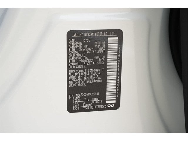 Radiant White/Black Obsidian 2026 INFINITI QX80 AUTOGRAPH 4WD 9-Speed Automatic 3.5L V6 DOHC 24V 3rd row seats: bench, 4-Wheel Disc Brakes, ABS brakes, Adaptive suspension, Air Conditioning, Alloy wheels, AM/FM radio: SiriusXM with 360L, Anti-whiplash front head restraints, Apple CarPlay/Android Auto, Audio memory, Auto High-beam Headlights, Auto tilt-away steering wheel, Auto-dimming door mirrors, Auto-dimming Rear-View mirror, Auto-leveling suspension, Automatic temperature control, Brake assist, Bumpers: body-color, Compass, Delay-off headlights, Driver door bin, Driver vanity mirror, Dual front impact airbags, Dual front side impact airbags, Electronic Stability Control, Emergency communication system: INFINITI InTouch, Four wheel independent suspension, Front anti-roll bar, Front Bucket Seats, Front Center Armrest, Front dual zone A/C, Front reading lights, Fully automatic headlights, Garage door transmitter: myQ Connected Garage, Genuine wood dashboard insert, Genuine wood door panel insert, Heads-Up Display, Heated and Climate Controlled Front Bucket Seats with Massage, Heated door mirrors, Heated front seats, Heated rear seats, Heated steering wheel, HVAC memory, Illuminated entry, Knee airbag, Leather steering wheel, Low tire pressure warning, Memory seat, Navigation system: Google Built-in, Occupant sensing airbag, Outside temperature display, Overhead airbag, Overhead console, Panic alarm, Passenger door bin, Passenger vanity mirror, Power door mirrors, Power driver seat, Power Liftgate, Power moonroof, Power passenger seat, Power steering, Power windows, Radio data system, Radio: Klipsch Premiere Audio System, Rain sensing wipers, Rear air conditioning, Rear anti-roll bar, Rear reading lights, Rear seat center armrest, Rear window defroster, Rear window wiper, Reclining 3rd row seat, Remote keyless entry, Security system, Semi-Aniline Premium Leather Seating Surfaces, Speed control, Speed-sensing steering, Split folding rear seat, Spoiler, Steering wheel memory, Steering wheel mounted audio controls, Tachometer, Telescoping steering wheel, Tilt steering wheel, Traction control, Trip computer, Turn signal indicator mirrors, Variably intermittent wipers, Ventilated front seats, Ventilated rear seats, Wheels: 22 x 8.5J Cast Aluminum-Alloy.