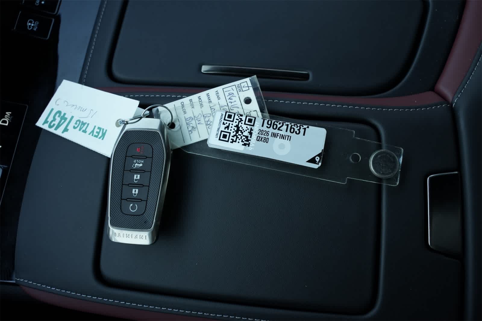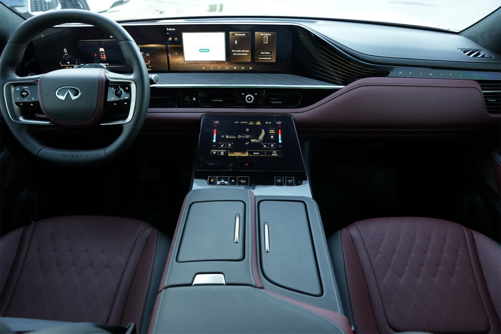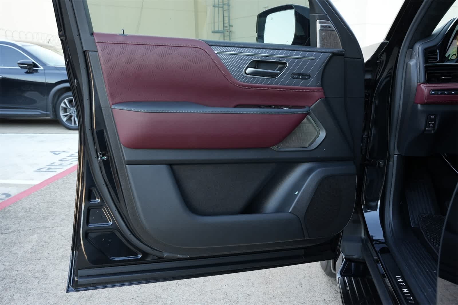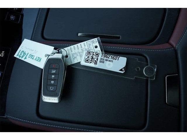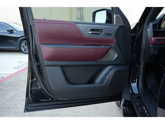 Mineral Black/Graphite Shadow 2026 INFINITI QX80 AUTOGRAPH 4WD 9-Speed Automatic 3.5L V6 DOHC 24V 3rd row seats: bench, 4-Wheel Disc Brakes, ABS brakes, Adaptive suspension, Air Conditioning, Alloy wheels, AM/FM radio: SiriusXM with 360L, Anti-whiplash front head restraints, Apple CarPlay/Android Auto, Audio memory, Auto High-beam Headlights, Auto tilt-away steering wheel, Auto-dimming door mirrors, Auto-dimming Rear-View mirror, Auto-leveling suspension, Automatic temperature control, Brake assist, Bumpers: body-color, Compass, Delay-off headlights, Driver door bin, Driver vanity mirror, Dual front impact airbags, Dual front side impact airbags, Electronic Stability Control, Emergency communication system: INFINITI InTouch, Four wheel independent suspension, Front anti-roll bar, Front Bucket Seats, Front Center Armrest, Front dual zone A/C, Front reading lights, Fully automatic headlights, Garage door transmitter: myQ Connected Garage, Genuine wood dashboard insert, Genuine wood door panel insert, Heads-Up Display, Heated and Climate Controlled Front Bucket Seats with Massage, Heated door mirrors, Heated front seats, Heated rear seats, Heated steering wheel, HVAC memory, Illuminated entry, Knee airbag, Leather steering wheel, Low tire pressure warning, Memory seat, Navigation system: Google Built-in, Occupant sensing airbag, Outside temperature display, Overhead airbag, Overhead console, Panic alarm, Passenger door bin, Passenger vanity mirror, Power door mirrors, Power driver seat, Power Liftgate, Power moonroof, Power passenger seat, Power steering, Power windows, Radio data system, Radio: Klipsch Premiere Audio System, Rain sensing wipers, Rear air conditioning, Rear anti-roll bar, Rear reading lights, Rear seat center armrest, Rear window defroster, Rear window wiper, Reclining 3rd row seat, Remote keyless entry, Security system, Semi-Aniline Premium Leather Seating Surfaces, Speed control, Speed-sensing steering, Split folding rear seat, Spoiler, Steering wheel memory, Steering wheel mounted audio controls, Tachometer, Telescoping steering wheel, Tilt steering wheel, Traction control, Trip computer, Turn signal indicator mirrors, Variably intermittent wipers, Ventilated front seats, Ventilated rear seats, Wheels: 22 x 8.5J Cast Aluminum-Alloy.