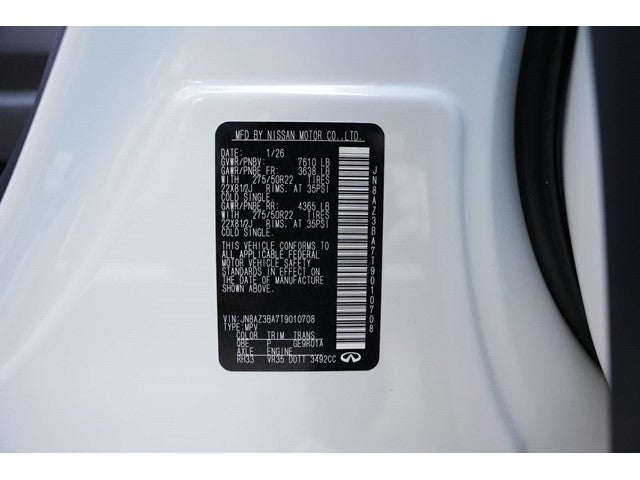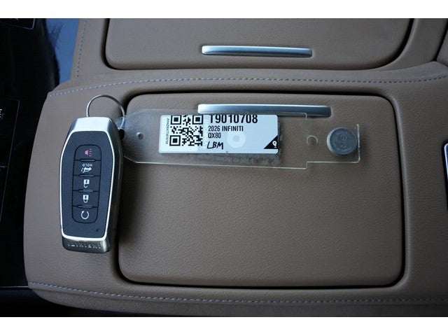 Radiant White 2026 INFINITI QX80 LUXE RWD 9-Speed Automatic 3.5L V6 DOHC 24V 14 Speakers, 3rd row seats: bench, 4-Wheel Disc Brakes, ABS brakes, Adaptive suspension, Air Conditioning, Alloy wheels, AM/FM radio: SiriusXM with 360L, Anti-whiplash front head restraints, Apple CarPlay/Android Auto, Audio memory, Auto High-beam Headlights, Auto tilt-away steering wheel, Auto-dimming door mirrors, Auto-dimming Rear-View mirror, Auto-leveling suspension, Automatic temperature control, Brake assist, Bumpers: body-color, Compass, Delay-off headlights, Driver door bin, Driver vanity mirror, Dual front impact airbags, Dual front side impact airbags, Electronic Stability Control, Emergency communication system: INFINITI InTouch, Four wheel independent suspension, Front anti-roll bar, Front Bucket Seats, Front Center Armrest, Front dual zone A/C, Front reading lights, Fully automatic headlights, Garage door transmitter: myQ Connected Garage, Heads-Up Display, Heated and Climate Controlled Front Bucket Seats, Heated door mirrors, Heated front seats, Heated rear seats, Heated steering wheel, HVAC memory, Illuminated entry, Knee airbag, Leather Seating Surfaces, Leather steering wheel, Low tire pressure warning, Memory seat, Navigation system: Google Built-in, Occupant sensing airbag, Outside temperature display, Overhead airbag, Overhead console, Panic alarm, Passenger door bin, Passenger vanity mirror, Power door mirrors, Power driver seat, Power Liftgate, Power moonroof, Power passenger seat, Power steering, Power windows, Radio data system, Radio: Klipsch Premium Audio System, Rain sensing wipers, Rear air conditioning, Rear anti-roll bar, Rear reading lights, Rear seat center armrest, Rear window defroster, Rear window wiper, Reclining 3rd row seat, Remote keyless entry, Security system, Speed control, Speed-sensing steering, Split folding rear seat, Spoiler, Steering wheel memory, Steering wheel mounted audio controls, Tachometer, Telescoping steering wheel, Tilt steering wheel, Traction control, Trip computer, Turn signal indicator mirrors, Variably intermittent wipers, Ventilated front seats, Ventilated rear seats, Wheels: 22 x 8.5J Cast Aluminum Alloy.