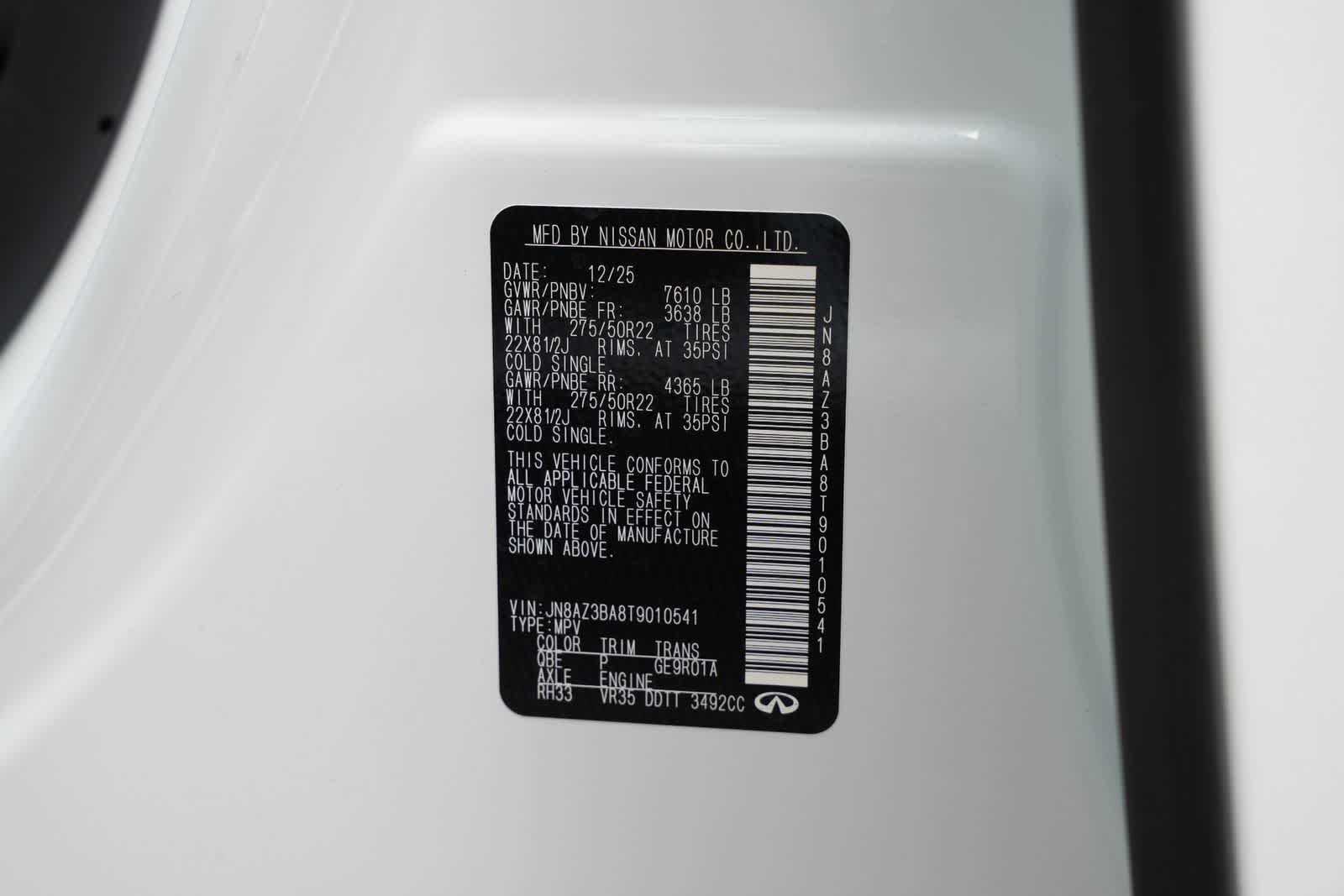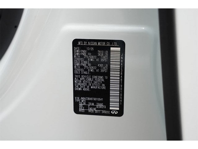 Radiant White 2026 INFINITI QX80 LUXE RWD 9-Speed Automatic 3.5L V6 DOHC 24V 14 Speakers, 3rd row seats: bench, 4-Wheel Disc Brakes, ABS brakes, Adaptive suspension, Air Conditioning, Alloy wheels, AM/FM radio: SiriusXM with 360L, Anti-whiplash front head restraints, Apple CarPlay/Android Auto, Audio memory, Auto High-beam Headlights, Auto tilt-away steering wheel, Auto-dimming door mirrors, Auto-dimming Rear-View mirror, Auto-leveling suspension, Automatic temperature control, Brake assist, Bumpers: body-color, Compass, Delay-off headlights, Driver door bin, Driver vanity mirror, Dual front impact airbags, Dual front side impact airbags, Electronic Stability Control, Emergency communication system: INFINITI InTouch, Four wheel independent suspension, Front anti-roll bar, Front Bucket Seats, Front Center Armrest, Front dual zone A/C, Front reading lights, Fully automatic headlights, Garage door transmitter: myQ Connected Garage, Heads-Up Display, Heated and Climate Controlled Front Bucket Seats, Heated door mirrors, Heated front seats, Heated rear seats, Heated steering wheel, HVAC memory, Illuminated entry, Knee airbag, Leather Seating Surfaces, Leather steering wheel, Low tire pressure warning, Memory seat, Navigation system: Google Built-in, Occupant sensing airbag, Outside temperature display, Overhead airbag, Overhead console, Panic alarm, Passenger door bin, Passenger vanity mirror, Power door mirrors, Power driver seat, Power Liftgate, Power moonroof, Power passenger seat, Power steering, Power windows, Radio data system, Radio: Klipsch Premium Audio System, Rain sensing wipers, Rear air conditioning, Rear anti-roll bar, Rear reading lights, Rear seat center armrest, Rear window defroster, Rear window wiper, Reclining 3rd row seat, Remote keyless entry, Security system, Speed control, Speed-sensing steering, Split folding rear seat, Spoiler, Steering wheel memory, Steering wheel mounted audio controls, Tachometer, Telescoping steering wheel, Tilt steering wheel, Traction control, Trip computer, Turn signal indicator mirrors, Variably intermittent wipers, Ventilated front seats, Ventilated rear seats, Wheels: 22 x 8.5J Cast Aluminum Alloy.