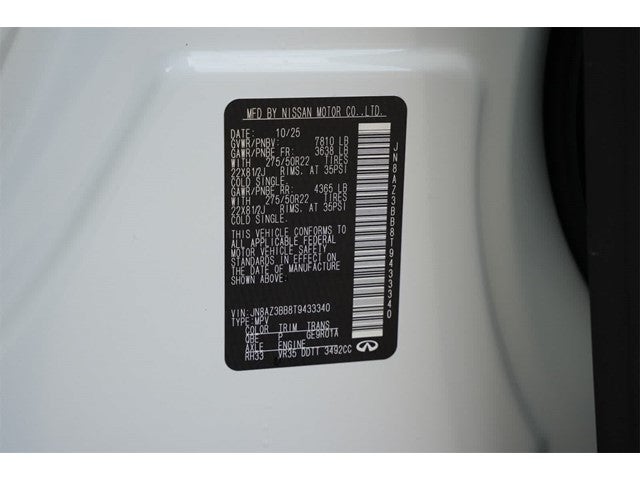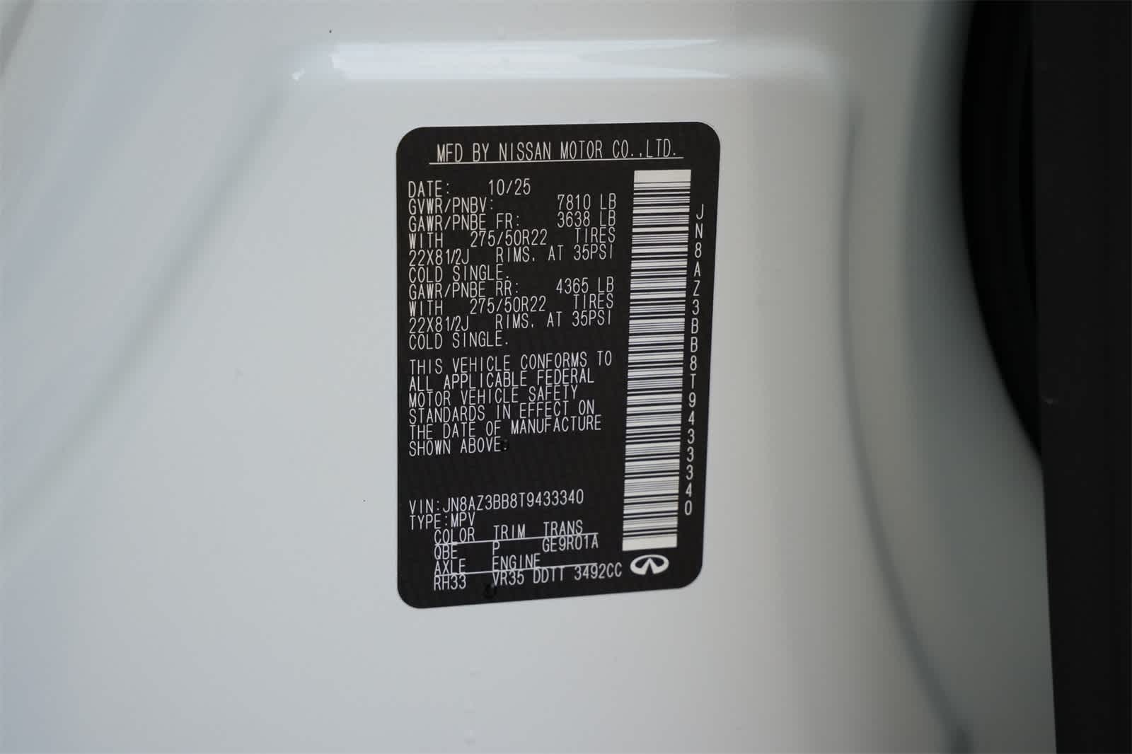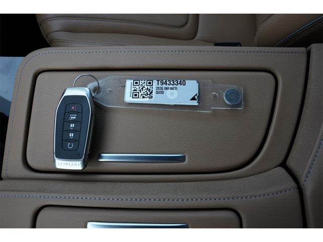 Radiant White 2026 INFINITI QX80 LUXE 4WD 9-Speed Automatic 3.5L V6 DOHC 24V 14 Speakers, 3rd row seats: bench, 4-Wheel Disc Brakes, ABS brakes, Adaptive suspension, Air Conditioning, Alloy wheels, AM/FM radio: SiriusXM with 360L, Anti-whiplash front head restraints, Apple CarPlay/Android Auto, Audio memory, Auto High-beam Headlights, Auto tilt-away steering wheel, Auto-dimming door mirrors, Auto-dimming Rear-View mirror, Auto-leveling suspension, Automatic temperature control, Brake assist, Bumpers: body-color, Compass, Delay-off headlights, Driver door bin, Driver vanity mirror, Dual front impact airbags, Dual front side impact airbags, Electronic Stability Control, Emergency communication system: INFINITI InTouch, Four wheel independent suspension, Front anti-roll bar, Front Bucket Seats, Front Center Armrest, Front dual zone A/C, Front reading lights, Fully automatic headlights, Garage door transmitter: myQ Connected Garage, Heads-Up Display, Heated and Climate Controlled Front Bucket Seats, Heated door mirrors, Heated front seats, Heated rear seats, Heated steering wheel, HVAC memory, Illuminated entry, Knee airbag, Leather Seating Surfaces, Leather steering wheel, Low tire pressure warning, Memory seat, Navigation system: Google Built-in, Occupant sensing airbag, Outside temperature display, Overhead airbag, Overhead console, Panic alarm, Passenger door bin, Passenger vanity mirror, Power door mirrors, Power driver seat, Power Liftgate, Power moonroof, Power passenger seat, Power steering, Power windows, Radio data system, Radio: Klipsch Premium Audio System, Rain sensing wipers, Rear air conditioning, Rear anti-roll bar, Rear reading lights, Rear seat center armrest, Rear window defroster, Rear window wiper, Reclining 3rd row seat, Remote keyless entry, Security system, Speed control, Speed-sensing steering, Split folding rear seat, Spoiler, Steering wheel memory, Steering wheel mounted audio controls, Tachometer, Telescoping steering wheel, Tilt steering wheel, Traction control, Trip computer, Turn signal indicator mirrors, Variably intermittent wipers, Ventilated front seats, Ventilated rear seats, Wheels: 22 x 8.5J Cast Aluminum Alloy.
