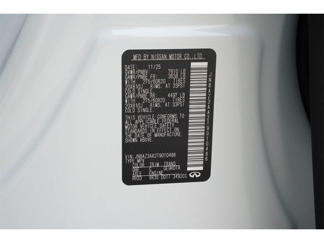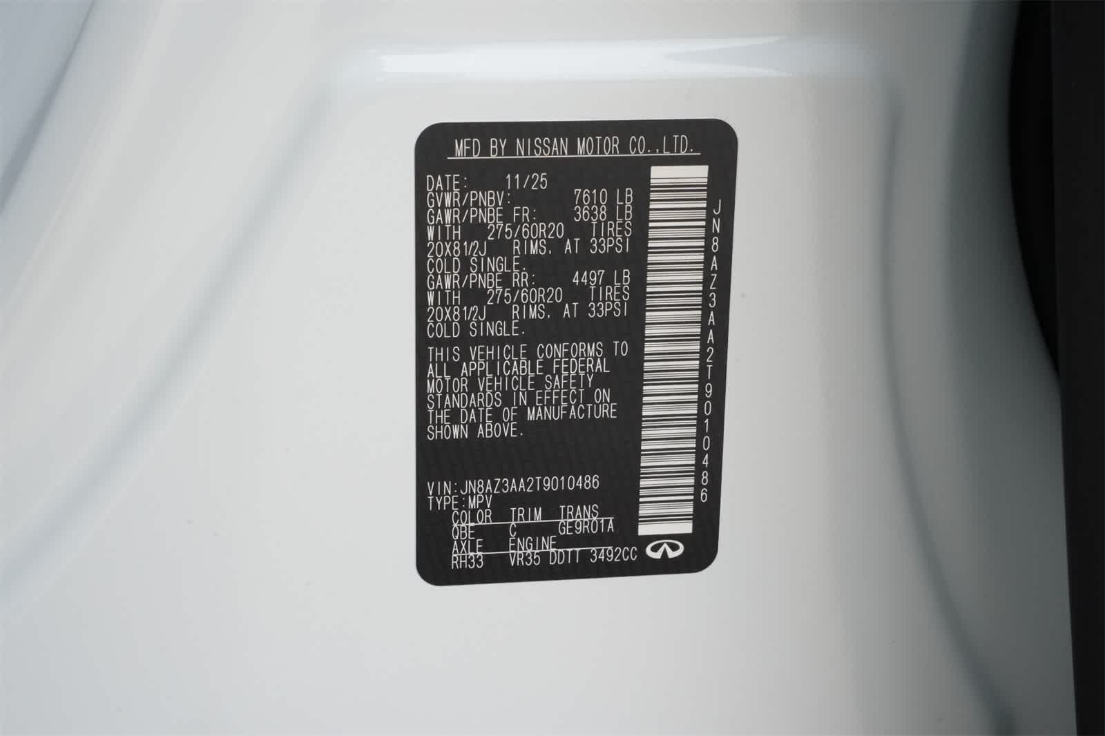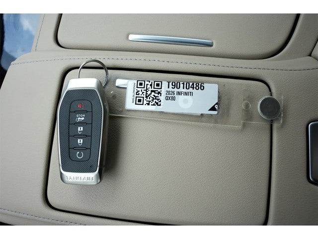 Radiant White 2026 INFINITI QX80 PURE RWD 9-Speed Automatic 3.5L V6 DOHC 24V 14 Speakers, 3rd row seats: bench, 4-Wheel Disc Brakes, ABS brakes, Air Conditioning, Alloy wheels, AM/FM radio: SiriusXM with 360L, Anti-whiplash front head restraints, Apple CarPlay/Android Auto, Audio memory, Auto High-beam Headlights, Auto tilt-away steering wheel, Auto-dimming door mirrors, Auto-dimming Rear-View mirror, Automatic temperature control, Brake assist, Bumpers: body-color, Compass, Delay-off headlights, Driver door bin, Driver vanity mirror, Dual front impact airbags, Dual front side impact airbags, Electronic Stability Control, Emergency communication system: INFINITI InTouch, Four wheel independent suspension, Front anti-roll bar, Front Bucket Seats, Front Center Armrest, Front dual zone A/C, Front reading lights, Fully automatic headlights, Garage door transmitter: myQ Connected Garage, Heated door mirrors, Heated Front Bucket Seats, Heated front seats, Heated rear seats, Heated steering wheel, HVAC memory, Illuminated entry, Knee airbag, Leather steering wheel, Low tire pressure warning, Memory seat, Navigation system: Google Built-in, Occupant sensing airbag, Outside temperature display, Overhead airbag, Overhead console, Panic alarm, Passenger door bin, Passenger vanity mirror, Power door mirrors, Power driver seat, Power Liftgate, Power moonroof, Power passenger seat, Power steering, Power windows, Radio data system, Radio: Klipsch Premium Audio System, Rain sensing wipers, Rear air conditioning, Rear anti-roll bar, Rear reading lights, Rear seat center armrest, Rear window defroster, Rear window wiper, Reclining 3rd row seat, Remote keyless entry, Security system, Speed control, Speed-sensing steering, Split folding rear seat, Spoiler, Steering wheel memory, Steering wheel mounted audio controls, Tachometer, Tailorfit-Appointed Seating Surfaces, Telescoping steering wheel, Tilt steering wheel, Traction control, Trip computer, Turn signal indicator mirrors, Variably intermittent wipers, Wheels: 20 x 8.5J Aluminum Alloy.