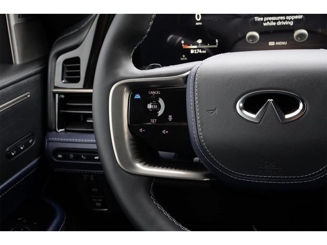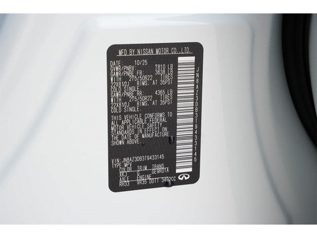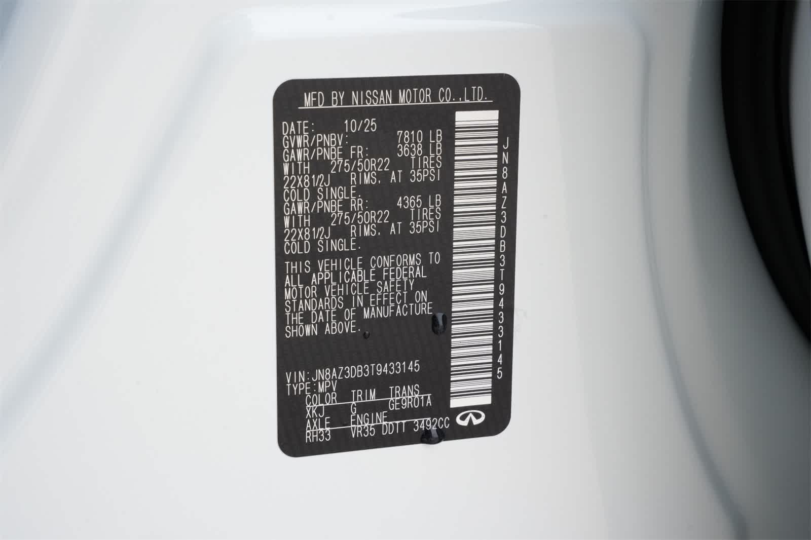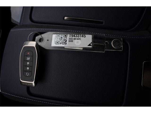 Radiant White/Black Obsidian 2026 INFINITI QX80 SPORT 4WD 9-Speed Automatic 3.5L V6 DOHC 24V 3rd row seats: bench, 4-Wheel Disc Brakes, ABS brakes, Adaptive suspension, Air Conditioning, Alloy wheels, AM/FM radio: SiriusXM with 360L, Anti-whiplash front head restraints, Apple CarPlay/Android Auto, Audio memory, Auto High-beam Headlights, Auto tilt-away steering wheel, Auto-dimming door mirrors, Auto-dimming Rear-View mirror, Auto-leveling suspension, Automatic temperature control, Brake assist, Compass, Delay-off headlights, Driver door bin, Driver vanity mirror, Dual front impact airbags, Dual front side impact airbags, Electronic Stability Control, Emergency communication system: INFINITI InTouch, Four wheel independent suspension, Front anti-roll bar, Front Bucket Seats, Front Center Armrest, Front dual zone A/C, Front reading lights, Fully automatic headlights, Garage door transmitter: HomeLink, Genuine wood dashboard insert, Genuine wood door panel insert, Heads-Up Display, Heated and Climate Controlled Front Bucket Seats with Massage, Heated door mirrors, Heated front seats, Heated rear seats, Heated steering wheel, HVAC memory, Illuminated entry, Knee airbag, Leather steering wheel, Low tire pressure warning, Memory seat, Navigation system: Google Built-in, Occupant sensing airbag, Outside temperature display, Overhead airbag, Overhead console, Panic alarm, Passenger door bin, Passenger vanity mirror, Power door mirrors, Power driver seat, Power Liftgate, Power moonroof, Power passenger seat, Power steering, Power windows, Radio data system, Radio: Klipsch Premiere Audio System, Rain sensing wipers, Rear air conditioning, Rear anti-roll bar, Rear reading lights, Rear seat center armrest, Rear window defroster, Rear window wiper, Reclining 3rd row seat, Remote keyless entry, Security system, Speed control, Speed-sensing steering, Split folding rear seat, Spoiler, Steering wheel memory, Steering wheel mounted audio controls, Tachometer, Telescoping steering wheel, Tilt steering wheel, Traction control, Trip computer, Turn signal indicator mirrors, Unique SPORT Semi-Aniline Leather Seating Surfaces, Variably intermittent wipers, Ventilated front seats, Ventilated rear seats, Wheels: 22 x 8.5J Unique SPORT Alloy.