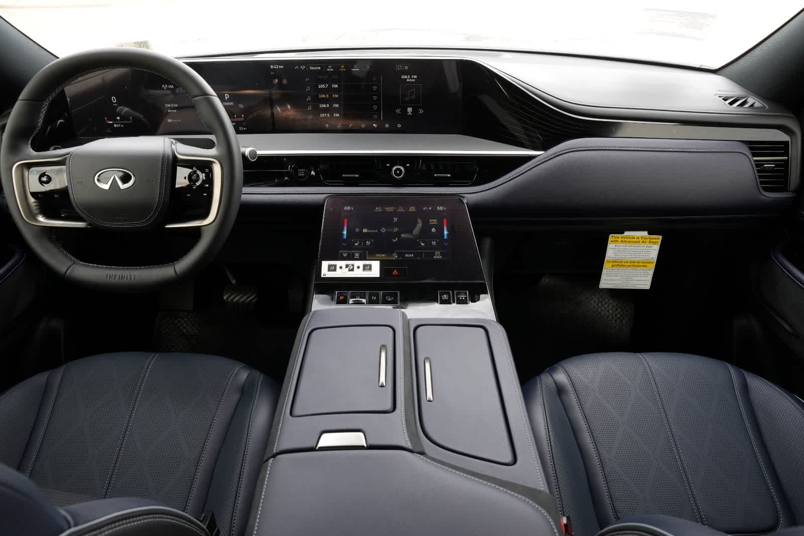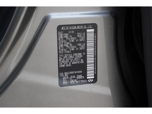 Dynamic Metal/Black Obsidian 2026 INFINITI QX80 SPORT 4WD 9-Speed Automatic 3.5L V6 DOHC 24V 3rd row seats: bench, 4-Wheel Disc Brakes, ABS brakes, Adaptive suspension, Air Conditioning, Alloy wheels, AM/FM radio: SiriusXM with 360L, Anti-whiplash front head restraints, Apple CarPlay/Android Auto, Audio memory, Auto High-beam Headlights, Auto tilt-away steering wheel, Auto-dimming door mirrors, Auto-dimming Rear-View mirror, Auto-leveling suspension, Automatic temperature control, Brake assist, Compass, Delay-off headlights, Driver door bin, Driver vanity mirror, Dual front impact airbags, Dual front side impact airbags, Electronic Stability Control, Emergency communication system: INFINITI InTouch, Four wheel independent suspension, Front anti-roll bar, Front Bucket Seats, Front Center Armrest, Front dual zone A/C, Front reading lights, Fully automatic headlights, Garage door transmitter: HomeLink, Genuine wood dashboard insert, Genuine wood door panel insert, Heads-Up Display, Heated and Climate Controlled Front Bucket Seats with Massage, Heated door mirrors, Heated front seats, Heated rear seats, Heated steering wheel, HVAC memory, Illuminated entry, Knee airbag, Leather steering wheel, Low tire pressure warning, Memory seat, Navigation system: Google Built-in, Occupant sensing airbag, Outside temperature display, Overhead airbag, Overhead console, Panic alarm, Passenger door bin, Passenger vanity mirror, Power door mirrors, Power driver seat, Power Liftgate, Power moonroof, Power passenger seat, Power steering, Power windows, Radio data system, Radio: Klipsch Premiere Audio System, Rain sensing wipers, Rear air conditioning, Rear anti-roll bar, Rear reading lights, Rear seat center armrest, Rear window defroster, Rear window wiper, Reclining 3rd row seat, Remote keyless entry, Security system, Speed control, Speed-sensing steering, Split folding rear seat, Spoiler, Steering wheel memory, Steering wheel mounted audio controls, Tachometer, Telescoping steering wheel, Tilt steering wheel, Traction control, Trip computer, Turn signal indicator mirrors, Unique SPORT Semi-Aniline Leather Seating Surfaces, Variably intermittent wipers, Ventilated front seats, Ventilated rear seats, Wheels: 22 x 8.5J Unique SPORT Alloy.