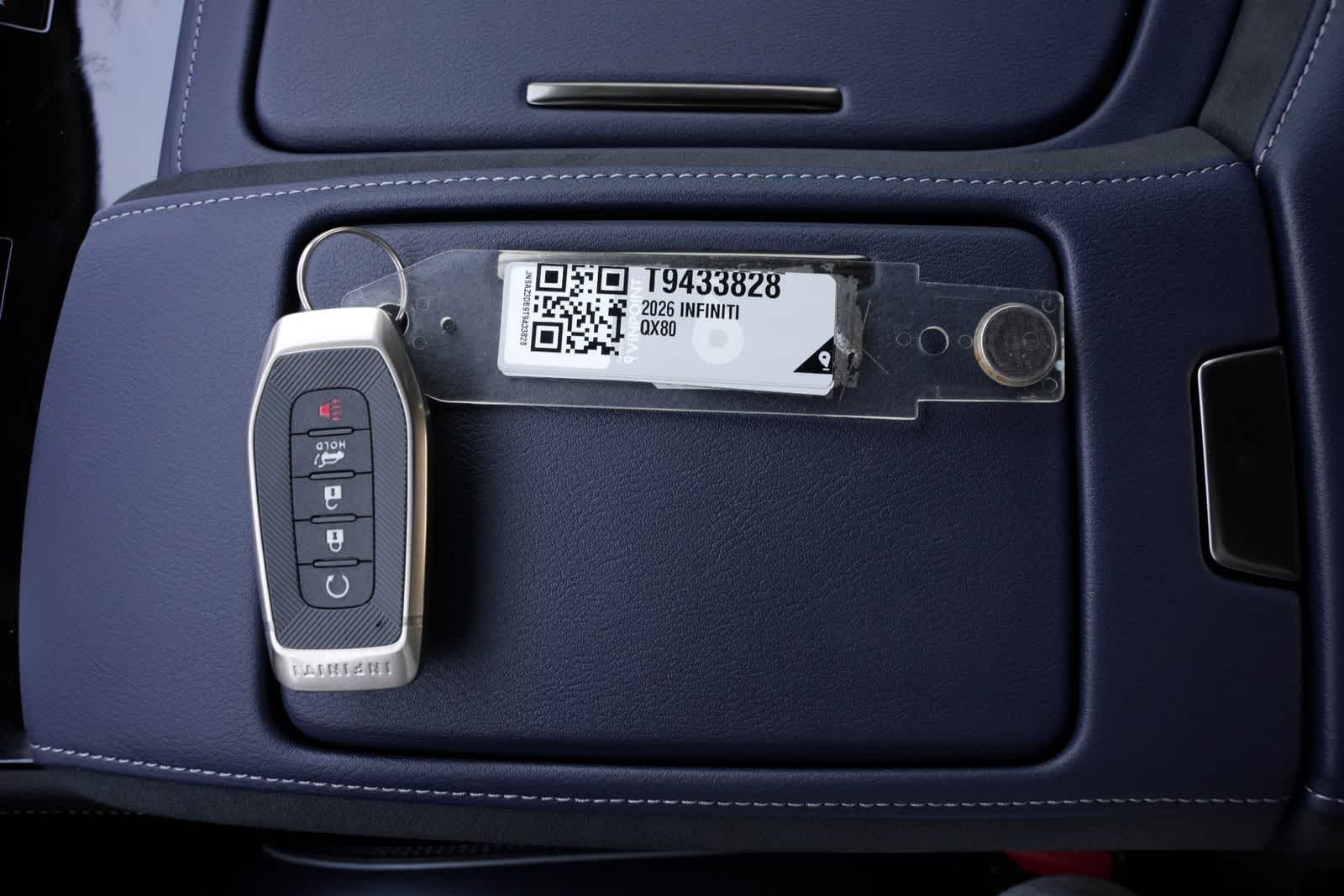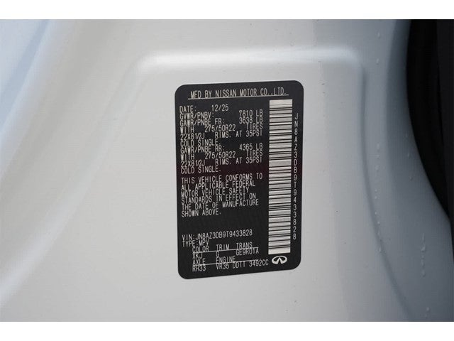 Radiant White/Black Obsidian 2026 INFINITI QX80 SPORT 4WD 9-Speed Automatic 3.5L V6 DOHC 24V 3rd row seats: bench, 4-Wheel Disc Brakes, ABS brakes, Adaptive suspension, Air Conditioning, Alloy wheels, AM/FM radio: SiriusXM with 360L, Anti-whiplash front head restraints, Apple CarPlay/Android Auto, Audio memory, Auto High-beam Headlights, Auto tilt-away steering wheel, Auto-dimming door mirrors, Auto-dimming Rear-View mirror, Auto-leveling suspension, Automatic temperature control, Brake assist, Compass, Delay-off headlights, Driver door bin, Driver vanity mirror, Dual front impact airbags, Dual front side impact airbags, Electronic Stability Control, Emergency communication system: INFINITI InTouch, Four wheel independent suspension, Front anti-roll bar, Front Bucket Seats, Front Center Armrest, Front dual zone A/C, Front reading lights, Fully automatic headlights, Garage door transmitter: HomeLink, Genuine wood dashboard insert, Genuine wood door panel insert, Heads-Up Display, Heated and Climate Controlled Front Bucket Seats with Massage, Heated door mirrors, Heated front seats, Heated rear seats, Heated steering wheel, HVAC memory, Illuminated entry, Knee airbag, Leather steering wheel, Low tire pressure warning, Memory seat, Navigation system: Google Built-in, Occupant sensing airbag, Outside temperature display, Overhead airbag, Overhead console, Panic alarm, Passenger door bin, Passenger vanity mirror, Power door mirrors, Power driver seat, Power Liftgate, Power moonroof, Power passenger seat, Power steering, Power windows, Radio data system, Radio: Klipsch Premiere Audio System, Rain sensing wipers, Rear air conditioning, Rear anti-roll bar, Rear reading lights, Rear seat center armrest, Rear window defroster, Rear window wiper, Reclining 3rd row seat, Remote keyless entry, Security system, Speed control, Speed-sensing steering, Split folding rear seat, Spoiler, Steering wheel memory, Steering wheel mounted audio controls, Tachometer, Telescoping steering wheel, Tilt steering wheel, Traction control, Trip computer, Turn signal indicator mirrors, Unique SPORT Semi-Aniline Leather Seating Surfaces, Variably intermittent wipers, Ventilated front seats, Ventilated rear seats, Wheels: 22 x 8.5J Unique SPORT Alloy.