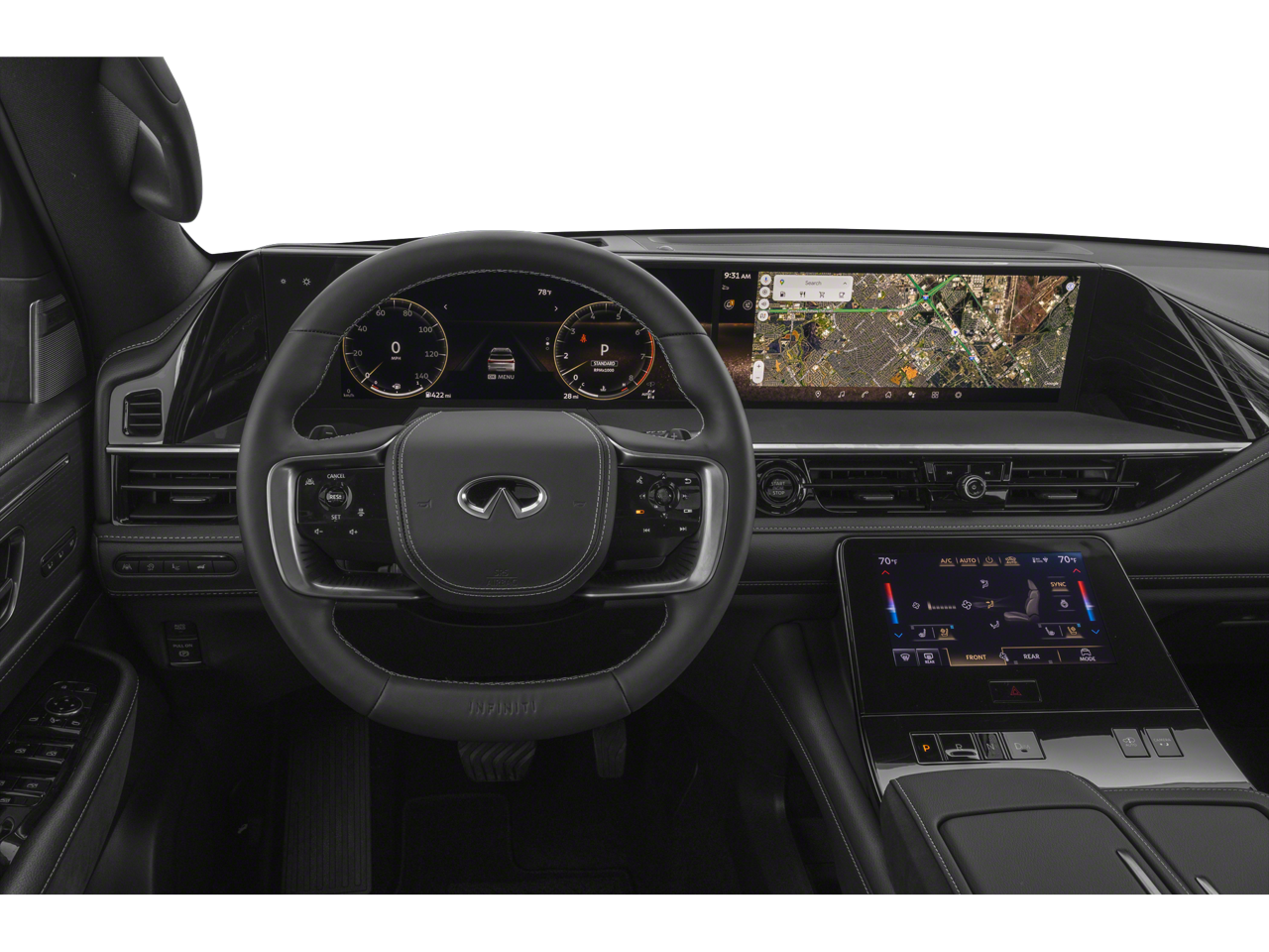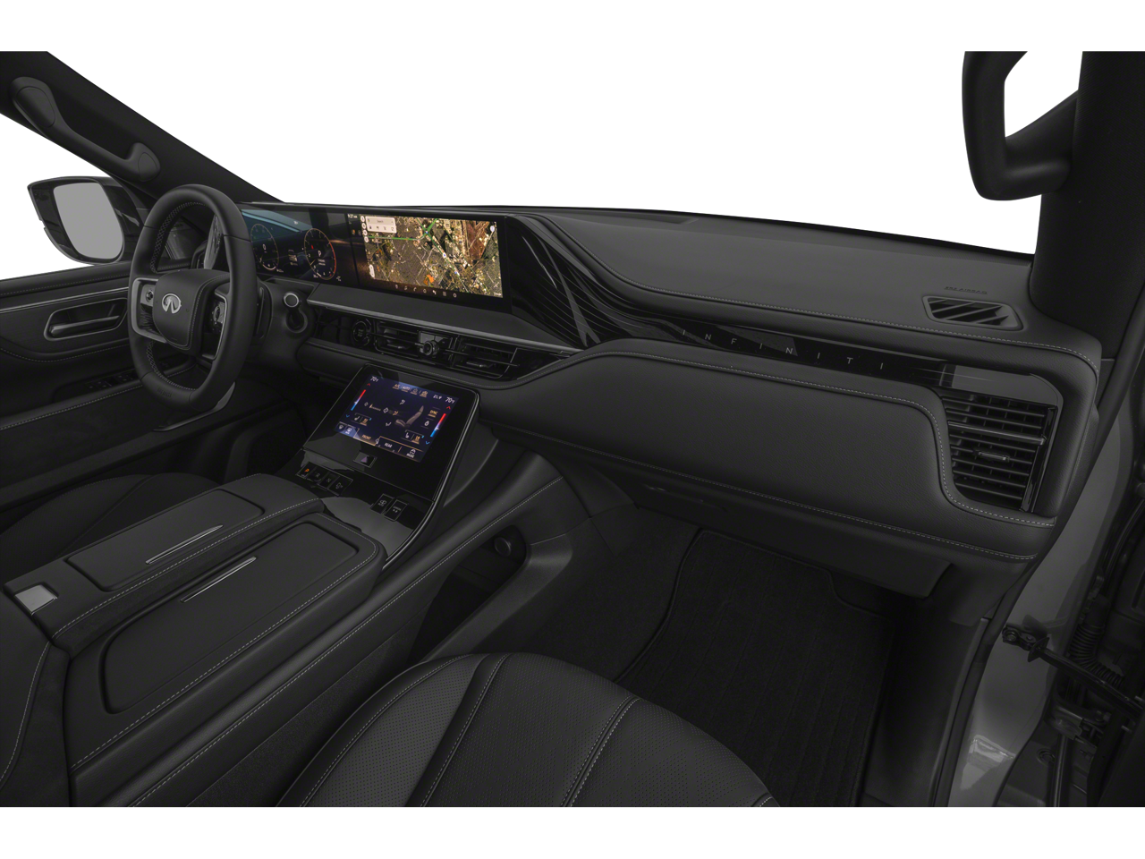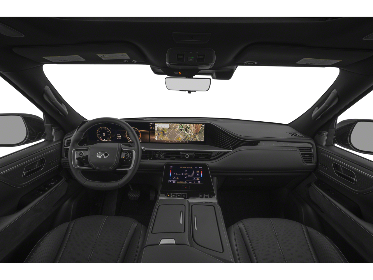 Radiant White/Black Obsidian 2026 INFINITI QX80 SPORT 4WD 9-Speed Automatic 3.5L V6 DOHC 24V 3rd row seats: bench, 4-Wheel Disc Brakes, ABS brakes, Adaptive suspension, Air Conditioning, Alloy wheels, AM/FM radio: SiriusXM with 360L, Anti-whiplash front head restraints, Apple CarPlay/Android Auto, Audio memory, Auto High-beam Headlights, Auto tilt-away steering wheel, Auto-dimming door mirrors, Auto-dimming Rear-View mirror, Auto-leveling suspension, Automatic temperature control, Brake assist, Compass, Delay-off headlights, Driver door bin, Driver vanity mirror, Dual front impact airbags, Dual front side impact airbags, Electronic Stability Control, Emergency communication system: INFINITI InTouch, Four wheel independent suspension, Front anti-roll bar, Front Bucket Seats, Front Center Armrest, Front dual zone A/C, Front reading lights, Fully automatic headlights, Garage door transmitter: HomeLink, Genuine wood dashboard insert, Genuine wood door panel insert, Heads-Up Display, Heated and Climate Controlled Front Bucket Seats with Massage, Heated door mirrors, Heated front seats, Heated rear seats, Heated steering wheel, HVAC memory, Illuminated entry, Knee airbag, Leather steering wheel, Low tire pressure warning, Memory seat, Navigation system: Google Built-in, Occupant sensing airbag, Outside temperature display, Overhead airbag, Overhead console, Panic alarm, Passenger door bin, Passenger vanity mirror, Power door mirrors, Power driver seat, Power Liftgate, Power moonroof, Power passenger seat, Power steering, Power windows, Radio data system, Radio: Klipsch Premiere Audio System, Rain sensing wipers, Rear air conditioning, Rear anti-roll bar, Rear reading lights, Rear seat center armrest, Rear window defroster, Rear window wiper, Reclining 3rd row seat, Remote keyless entry, Security system, Speed control, Speed-sensing steering, Split folding rear seat, Spoiler, Steering wheel memory, Steering wheel mounted audio controls, Tachometer, Telescoping steering wheel, Tilt steering wheel, Traction control, Trip computer, Turn signal indicator mirrors, Unique SPORT Semi-Aniline Leather Seating Surfaces, Variably intermittent wipers, Ventilated front seats, Ventilated rear seats, Wheels: 22 x 8.5J Unique SPORT Alloy.