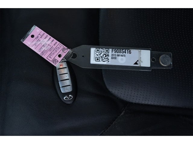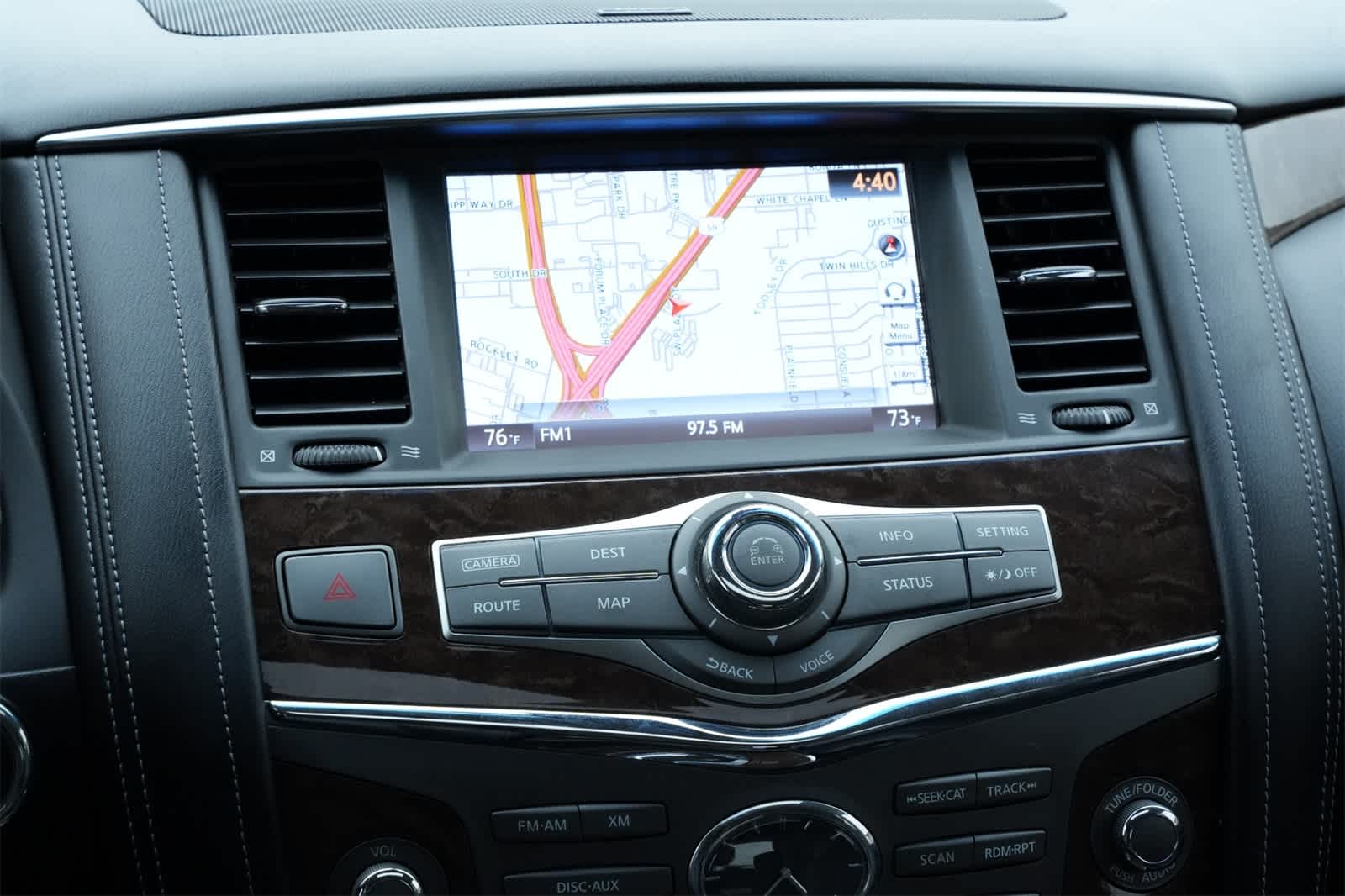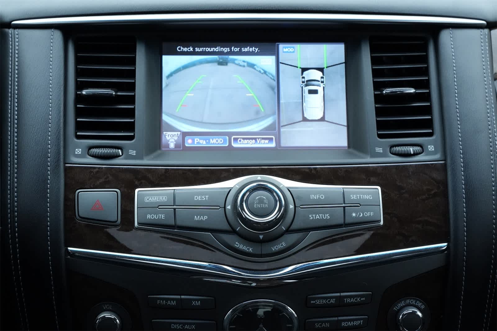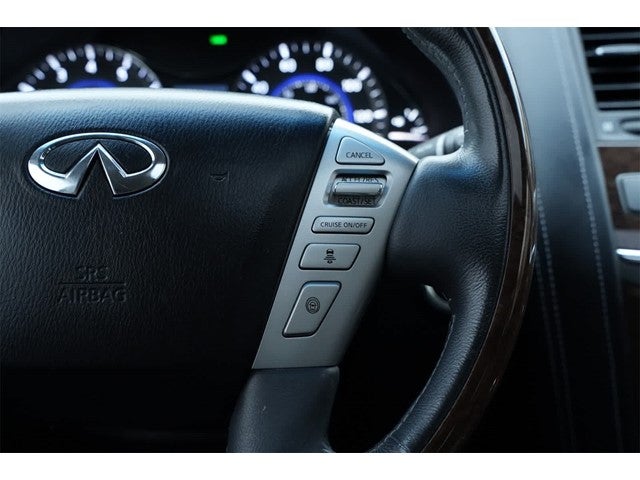 120V Power Outlet, 13 Speakers, 2.94 Axle Ratio, 22 Wheel Package, 3rd row seats: split-bench, 4-Wheel Disc Brakes, ABS brakes, Activation Disclaimer, Air Conditioning, Alloy wheels, AM/FM radio: SiriusXM, Anti-whiplash front head restraints, Auto High-beam Headlights, Auto tilt-away steering wheel, Auto-dimming door mirrors, Auto-dimming Rear-View mirror, Auto-leveling suspension, Automatic temperature control, Backup Collision Intervention (BCI), Blind Spot Warning, Brake assist, Bumpers: body-color, Carpeted Cargo Mat/Cargo Net & First Aid Kit, CD player, Delay-off headlights, Driver door bin, Driver vanity mirror, Drivers Assistance Package, Dual 7 Color Monitors, Dual front impact airbags, Dual front side impact airbags, Electronic Stability Control, Emergency communication system: INFINITI Connection, Four wheel independent suspension, Front anti-roll bar, Front Bucket Seats, Front Center Armrest, Front dual zone A/C, Front fog lights, Front reading lights, Fully automatic headlights, Garage door transmitter: HomeLink, Genuine wood console insert, Genuine wood dashboard insert, Genuine wood door panel insert, Heated 2nd-Row Seats, Heated door mirrors, Heated Front Bucket Seats, Heated front seats, Heated steering wheel, Illuminated entry, Illuminated Kick Plates, Intelligent Brake Assist (IBA), Intelligent Cruise Control (Full-Speed Range), Lane Departure Warning System, Leather Shift Knob, Leather steering wheel, Leather-Appointed Seats w/Mocha Burl Trim, Literature Kit, Low tire pressure warning, Memory seat, Navigation System, Occupant sensing airbag, Outside temperature display, Overhead airbag, Overhead console, Panic alarm, Passenger door bin, Passenger vanity mirror, Power door mirrors, Power driver seat, Power Liftgate, Power moonroof, Power passenger seat, Power steering, Power windows, Radio data system, Radio: Bose Premium Sound System w/Navigation, Rain sensing wipers, Rear air conditioning, Rear anti-roll bar, Rear audio controls, Rear reading lights, Rear seat center armrest, Rear window defroster, Rear window wiper, Reclining 3rd row seat, Remote keyless entry, Roof rack: rails only, Roof Rail Crossbars, Security system, Speed control, Speed-sensing steering, Split folding rear seat, Spoiler, Steering wheel memory, Steering wheel mounted audio controls, Tachometer, Telescoping steering wheel, Theater Package, Tilt steering wheel, Traction control, Trip computer, Turn signal indicator mirrors, Variably intermittent wipers, Voltmeter, Wheels: 20 Split 6-Spoke Aluminum-Alloy, Wheels: 22 x 8.0 14-Spoke Forged Aluminum-Alloy, Wireless Headphones (2).