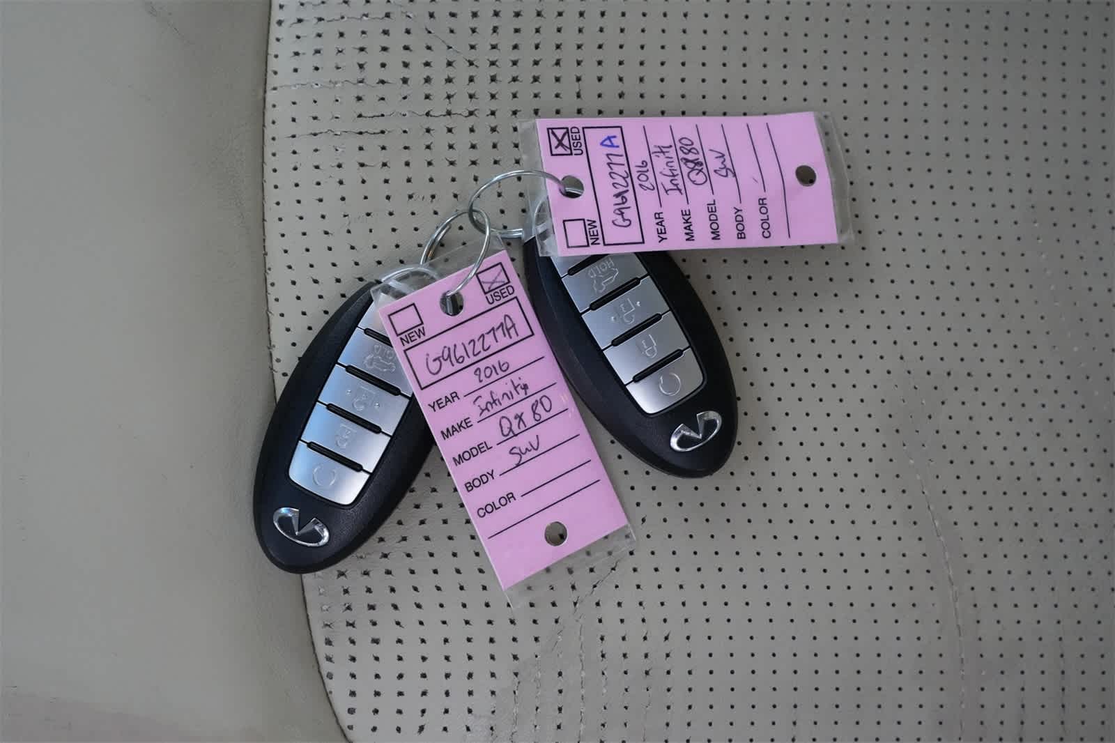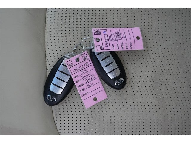 120V Power Outlet, 13 Speakers, 2.94 Axle Ratio, 3rd row seats: split-bench, 4-Wheel Disc Brakes, ABS brakes, Activation Disclaimer, Air Conditioning, Alloy wheels, AM/FM radio: SiriusXM, Anti-whiplash front head restraints, Auto High-beam Headlights, Auto tilt-away steering wheel, Auto-dimming door mirrors, Auto-dimming Rear-View mirror, Auto-leveling suspension, Automatic temperature control, Backup Collision Intervention (BCI), Blind Spot Warning, Bose Premium Sound System, Brake assist, Bumpers: body-color, Carpeted Cargo Mat/Cargo Net & First Aid Kit, CD player, Delay-off headlights, Driver door bin, Driver vanity mirror, Drivers Assistance Package, Dual 7 Color Monitors, Dual front impact airbags, Dual front side impact airbags, Electronic Stability Control, Emergency communication system: INFINITI Connection, Four wheel independent suspension, Front anti-roll bar, Front Bucket Seats, Front Center Armrest, Front dual zone A/C, Front fog lights, Front reading lights, Fully automatic headlights, Garage door transmitter: HomeLink, Genuine wood console insert, Genuine wood dashboard insert, Genuine wood door panel insert, Heated 2nd-Row Seats, Heated door mirrors, Heated Front Bucket Seats, Heated front seats, Heated steering wheel, Illuminated entry, Illuminated Kick Plates, Intelligent Cruise Control (Full-Speed Range), Leather Shift Knob, Leather steering wheel, Leather-Appointed Seats w/Mocha Burl Trim, Literature Kit, Low tire pressure warning, Memory seat, Navigation System, Occupant sensing airbag, Outside temperature display, Overhead airbag, Overhead console, Panic alarm, Passenger door bin, Passenger vanity mirror, Power door mirrors, Power driver seat, Power Liftgate, Power moonroof, Power passenger seat, Power steering, Power windows, Radio data system, Rain sensing wipers, Rear air conditioning, Rear anti-roll bar, Rear audio controls, Rear reading lights, Rear seat center armrest, Rear window defroster, Rear window wiper, Reclining 3rd row seat, Remote keyless entry, Roof rack: rails only, Roof Rail Crossbars, Security system, Speed control, Speed-sensing steering, Split folding rear seat, Spoiler, Steering wheel memory, Steering wheel mounted audio controls, Tachometer, Telescoping steering wheel, Theater Package, Tilt steering wheel, Traction control, Trip computer, Turn signal indicator mirrors, Variably intermittent wipers, Voltmeter, Wheels: 20 Split 6-Spoke Aluminum-Alloy, Wireless Headphones (2).