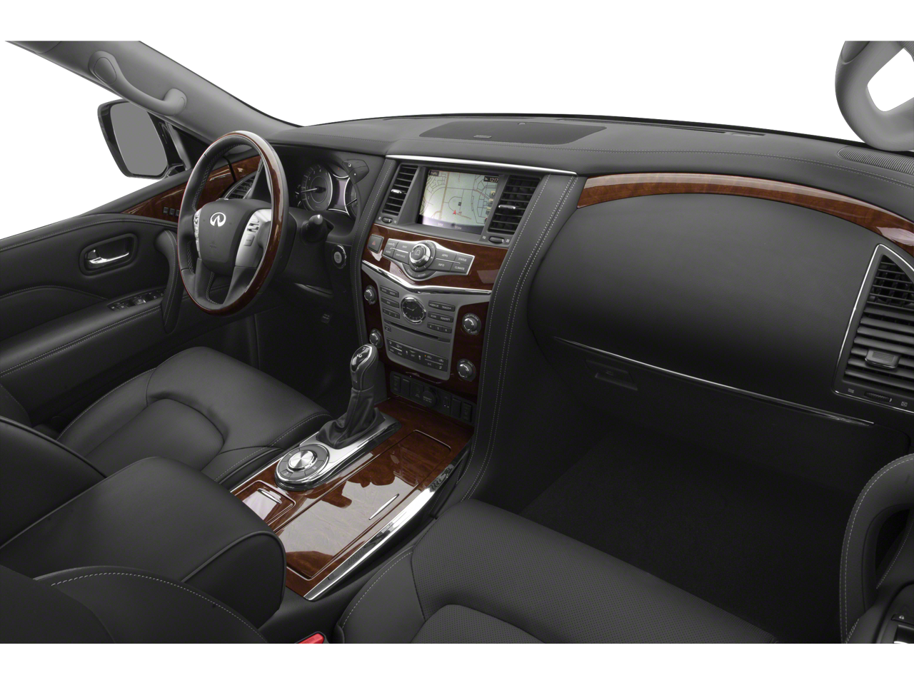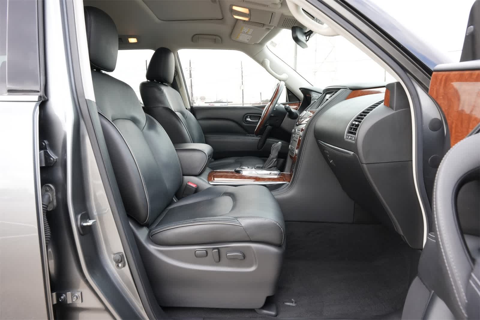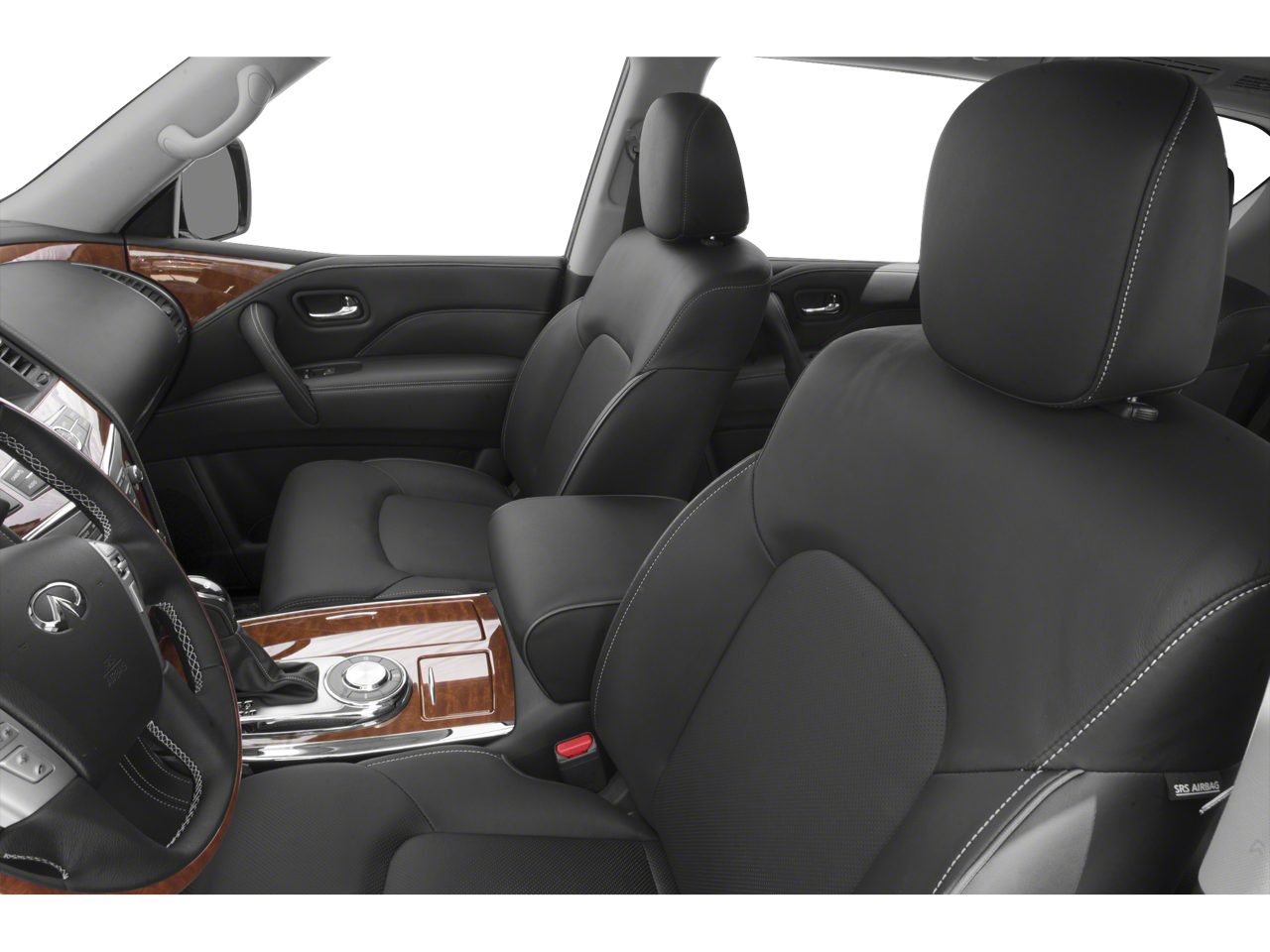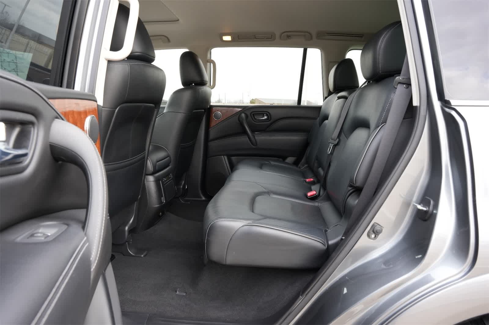 13 Speakers, 2.94 Axle Ratio, 3rd row seats: split-bench, 4-Wheel Disc Brakes, ABS brakes, Air Conditioning, Alloy wheels, AM/FM radio: SiriusXM, Anti-whiplash front head restraints, Auto High-beam Headlights, Auto tilt-away steering wheel, Auto-dimming door mirrors, Auto-dimming Rear-View mirror, Auto-leveling suspension, Automatic temperature control, Backup Collision Intervention (BCI), Blind Spot Intervention (BSI), Blind Spot Warning, Brake assist, Bumpers: body-color, Carpeted Cargo Mat/Cargo Net & First Aid Kit, CD player, Delay-off headlights, Driver Assistance Package, Driver door bin, Driver vanity mirror, Dual front impact airbags, Dual front side impact airbags, Electronic Stability Control, Emergency communication system: INFINITI Connection, Four wheel independent suspension, Front anti-roll bar, Front Bucket Seats, Front Center Armrest, Front dual zone A/C, Front fog lights, Front reading lights, Fully automatic headlights, Garage door transmitter: HomeLink, Genuine wood console insert, Genuine wood dashboard insert, Genuine wood door panel insert, Heated door mirrors, Heated Front Bucket Seats, Heated front seats, Heated steering wheel, Illuminated entry, INFINITI Radiant Illuminated Kick Plates, Intelligent Cruise Control (Full-Speed Range), Lane Departure Warning System, Leather Shift Knob, Leather steering wheel, Leather-Appointed Seats w/Stratford Burl Trim, Low tire pressure warning, Memory seat, Navigation System, Occupant sensing airbag, Outside temperature display, Overhead airbag, Overhead console, Panic alarm, Passenger door bin, Passenger vanity mirror, Power door mirrors, Power driver seat, Power Liftgate, Power moonroof, Power passenger seat, Power steering, Power windows, Radio data system, Radio: AM/FM/HD Single In-Dash CD/DVD Player w/MP3, Rain sensing wipers, Rear air conditioning, Rear anti-roll bar, Rear audio controls, Rear reading lights, Rear seat center armrest, Rear window defroster, Rear window wiper, Reclining 3rd row seat, Remote keyless entry, Roof rack: rails only, Security system, Speed control, Speed-sensing steering, Split Bench Seat Package, Split folding rear seat, Spoiler, Steering wheel memory, Steering wheel mounted audio controls, Tachometer, Telescoping steering wheel, Tilt steering wheel, Traction control, Trip computer, Turn signal indicator mirrors, Variably intermittent wipers, Voltmeter, Wheels: 20 x 8.0 Split 6-Spoke Aluminum-Alloy.