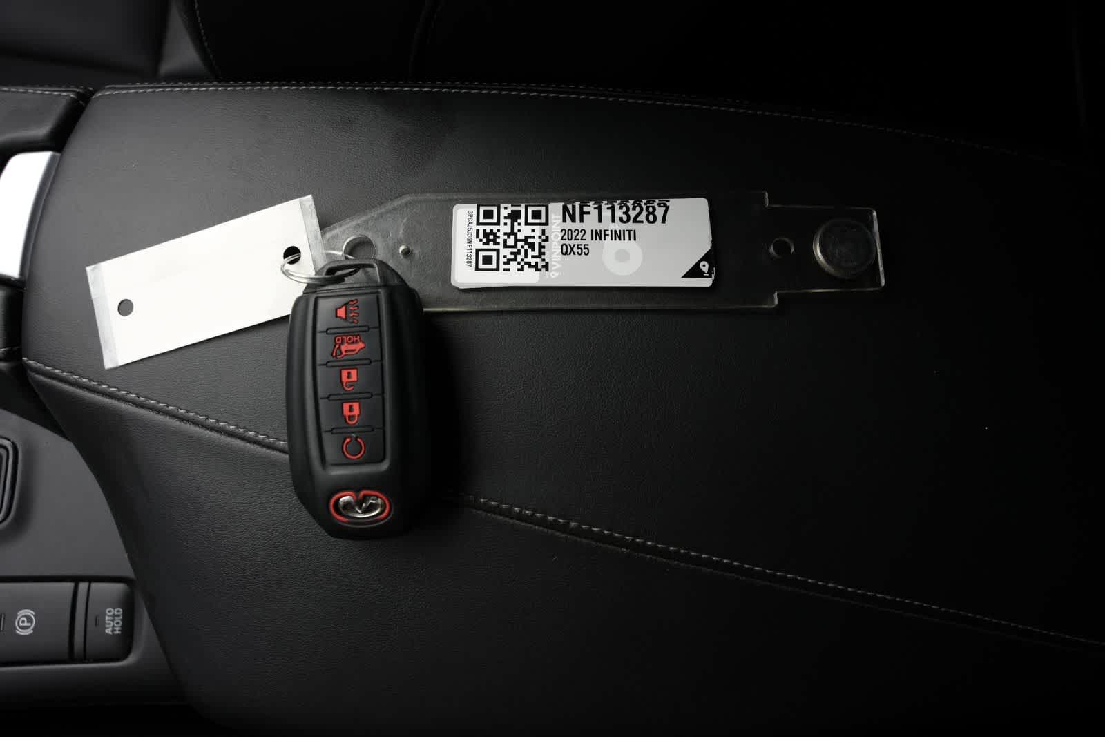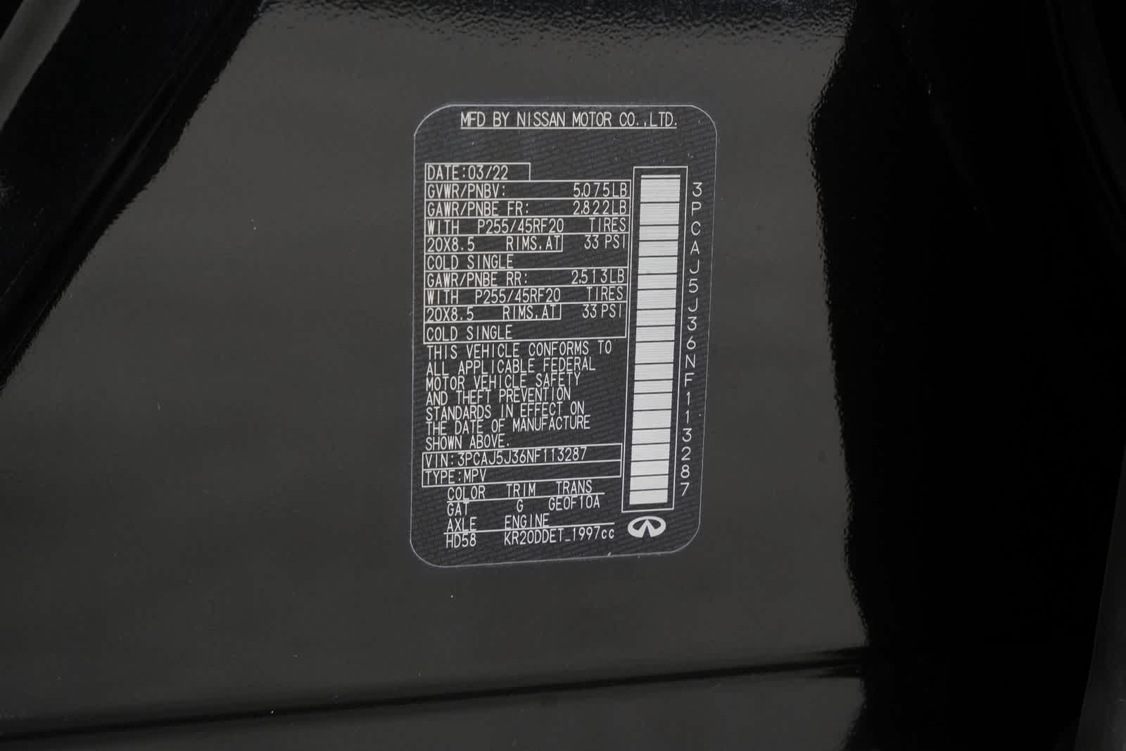 4-Wheel Disc Brakes, 5.846 Axle Ratio, 6 Speakers, ABS brakes, Air Conditioning, Alloy wheels, AM/FM radio: SiriusXM, AM/FM/CD Audio System, Auto High-beam Headlights, Auto-dimming Rear-View mirror, Automatic temperature control, Black Film Rear Bumper Protector, Black Splash Guards (Set of 4), Blind Spot Warning, Brake assist, Bumpers: body-color, Cargo Net, Cargo Package, Carpeted Floor Mats, CD player, Delay-off headlights, Driver door bin, Driver vanity mirror, Dual front impact airbags, Dual front side impact airbags, Electronic Stability Control, Emergency communication system: INFINITI InTouch, Exterior Parking Camera Rear, Four wheel independent suspension, Front anti-roll bar, Front Bucket Seats, Front Center Armrest, Front dual zone A/C, Front fog lights, Front reading lights, Fully automatic headlights, Garage door transmitter: HomeLink, Heated Front Bucket Seats, Heated front seats, Illuminated entry, Knee airbag, Leather Shift Knob, Leatherette Seat Trim, Low tire pressure warning, Occupant sensing airbag, Outside temperature display, Overhead airbag, Overhead console, Panic alarm, Passenger door bin, Passenger vanity mirror, Power door mirrors, Power driver seat, Power Liftgate, Power moonroof, Power passenger seat, Power steering, Power windows, Premium Paint, Radio data system, Rear anti-roll bar, Rear Parking Sensors, Rear reading lights, Rear seat center armrest, Rear window defroster, Rear window wiper, Remote keyless entry, Reversible Cargo Mat, Security system, Speed control, Speed-sensing steering, Speed-Sensitive Wipers, Split folding rear seat, Spoiler, Steering wheel mounted audio controls, Tachometer, Telescoping steering wheel, Tilt steering wheel, Traction control, Trip computer, Turn signal indicator mirrors, Variably intermittent wipers, Welcome Lighting, Wheels: 20 x 8.5 Machine Finish Aluminum Alloy.