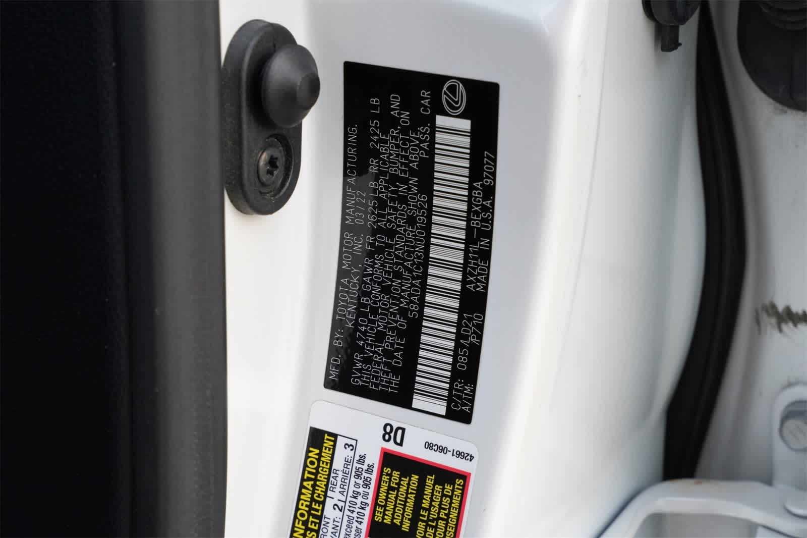 2.5L I4 DOHC 16V, Black Artificial Leather, 10 Speakers, 10-Way Power Adjustable Front Seats, 4-Wheel Disc Brakes, ABS brakes, Air Conditioning, Alloy wheels, AM/FM radio: SiriusXM, Apple CarPlay/Android Auto, Auto High-beam Headlights, Auto-dimming door mirrors, Auto-dimming Rear-View mirror, Automatic temperature control, Brake assist, Bumpers: body-color, CD player, Compass, Delay-off headlights, Driver door bin, Driver vanity mirror, Dual front impact airbags, Dual front side impact airbags, Electronic Stability Control, Emergency communication system, Exterior Parking Camera Rear, Four wheel independent suspension, Front anti-roll bar, Front Bucket Seats, Front Center Armrest, Front dual zone A/C, Front reading lights, Fully automatic headlights, Garage door transmitter: HomeLink, Heated door mirrors, Illuminated entry, Knee airbag, Leather Shift Knob, Leather steering wheel, Low tire pressure warning, Occupant sensing airbag, Outside temperature display, Overhead airbag, Overhead console, Panic alarm, Passenger door bin, Passenger vanity mirror, Perforated NuLuxe Seat Trim, Power door mirrors, Power driver seat, Power moonroof, Power passenger seat, Power steering, Power windows, Radio data system, Radio: Lexus Multimedia System, Rear anti-roll bar, Rear reading lights, Rear seat center armrest, Rear side impact airbag, Rear window defroster, Remote keyless entry, Security system, Speed control, Speed-sensing steering, Steering wheel mounted audio controls, Tachometer, Telescoping steering wheel, Tilt steering wheel, Traction control, Trip computer, Turn signal indicator mirrors, Variably intermittent wipers, Wheels: 17 x 7.5J Twin-V-Spoke Alloy, 2.5L I4 DOHC 16V, Black Artificial Leather.