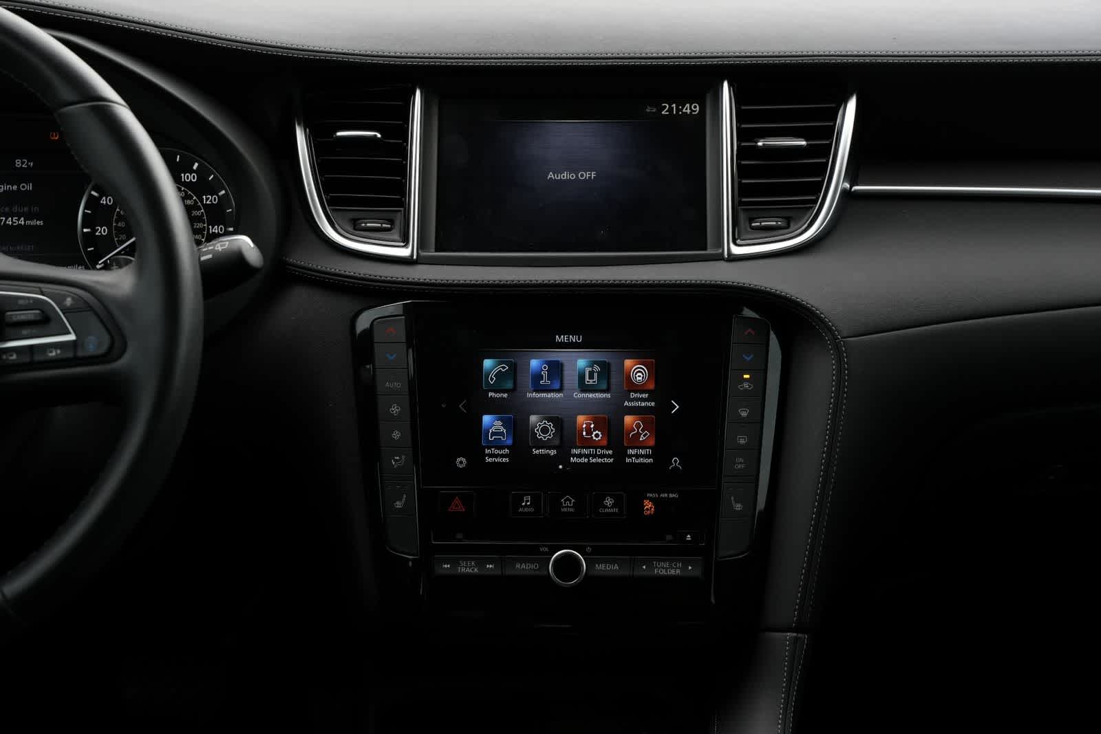 - Radio: HD Audio System -inc: INFINITI InTouch, INFINITI InTouch services, INFINITI InTouch dual display system w/upper 8" and lower 7" HD touch screens, wireless Apple CarPlay, Android Auto, HD radio technology, SiriusXM radio w/advanced audio features and 90-day complimentary trial, INFINITI voice recognition, Siri Eyes Free, Wi-Fi hotspot and active noise cancellation