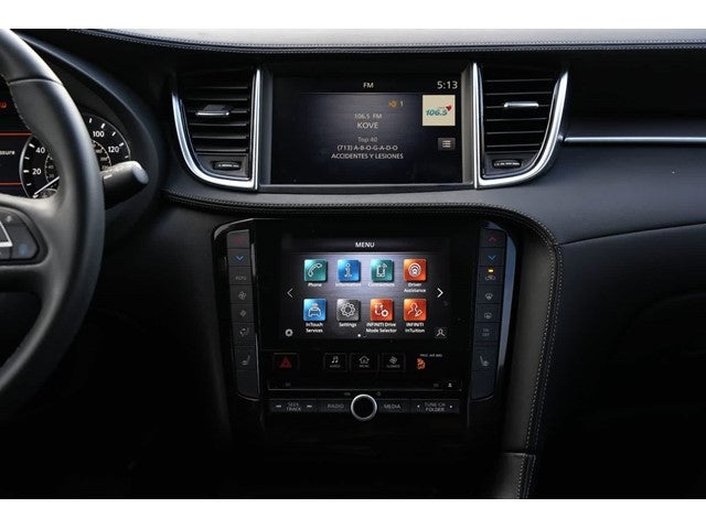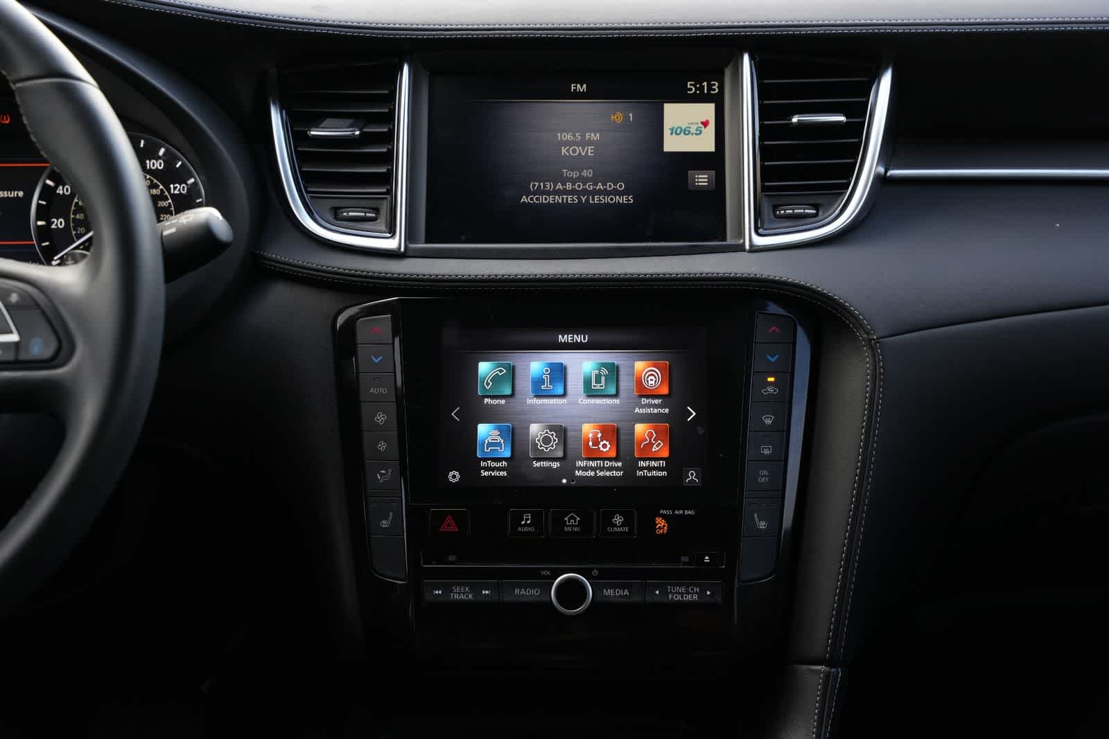 - Radio: HD Audio System -inc: INFINITI InTouch, INFINITI InTouch services, INFINITI InTouch dual display system w/upper 8" and lower 7" HD touch screens, wireless Apple CarPlay, Android Auto, HD radio technology, SiriusXM radio w/advanced audio features and 90-day complimentary trial, INFINITI voice recognition, Siri Eyes Free, Wi-Fi hotspot and active noise cancellation