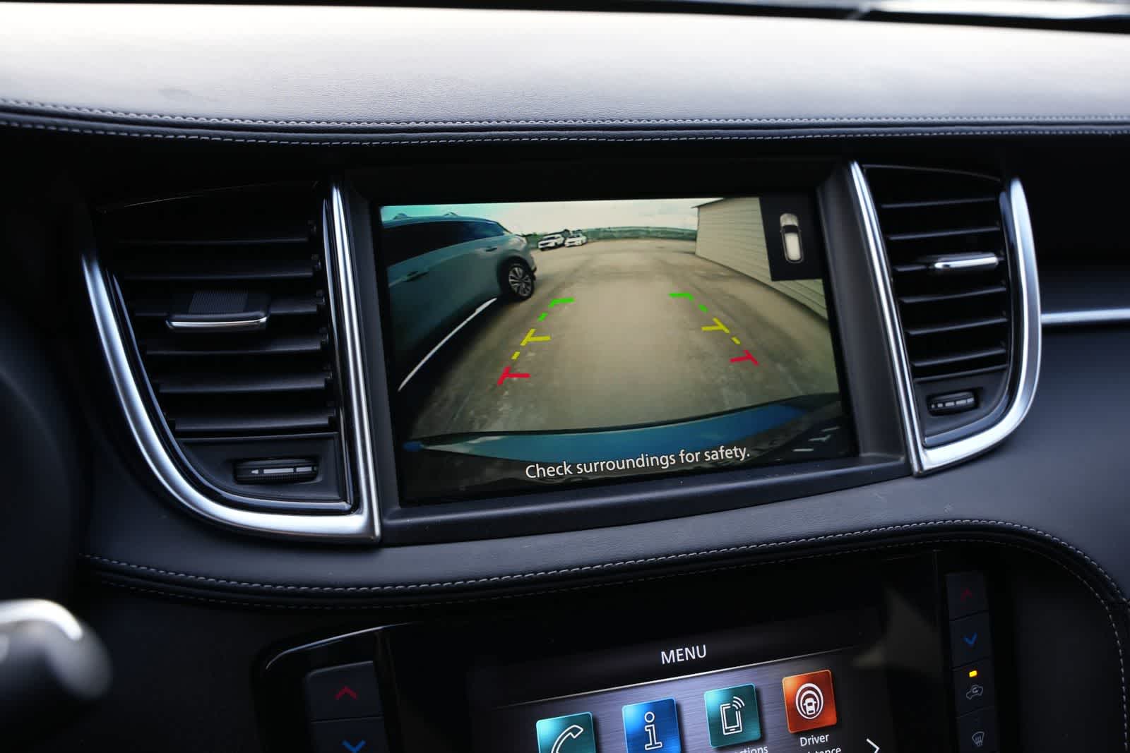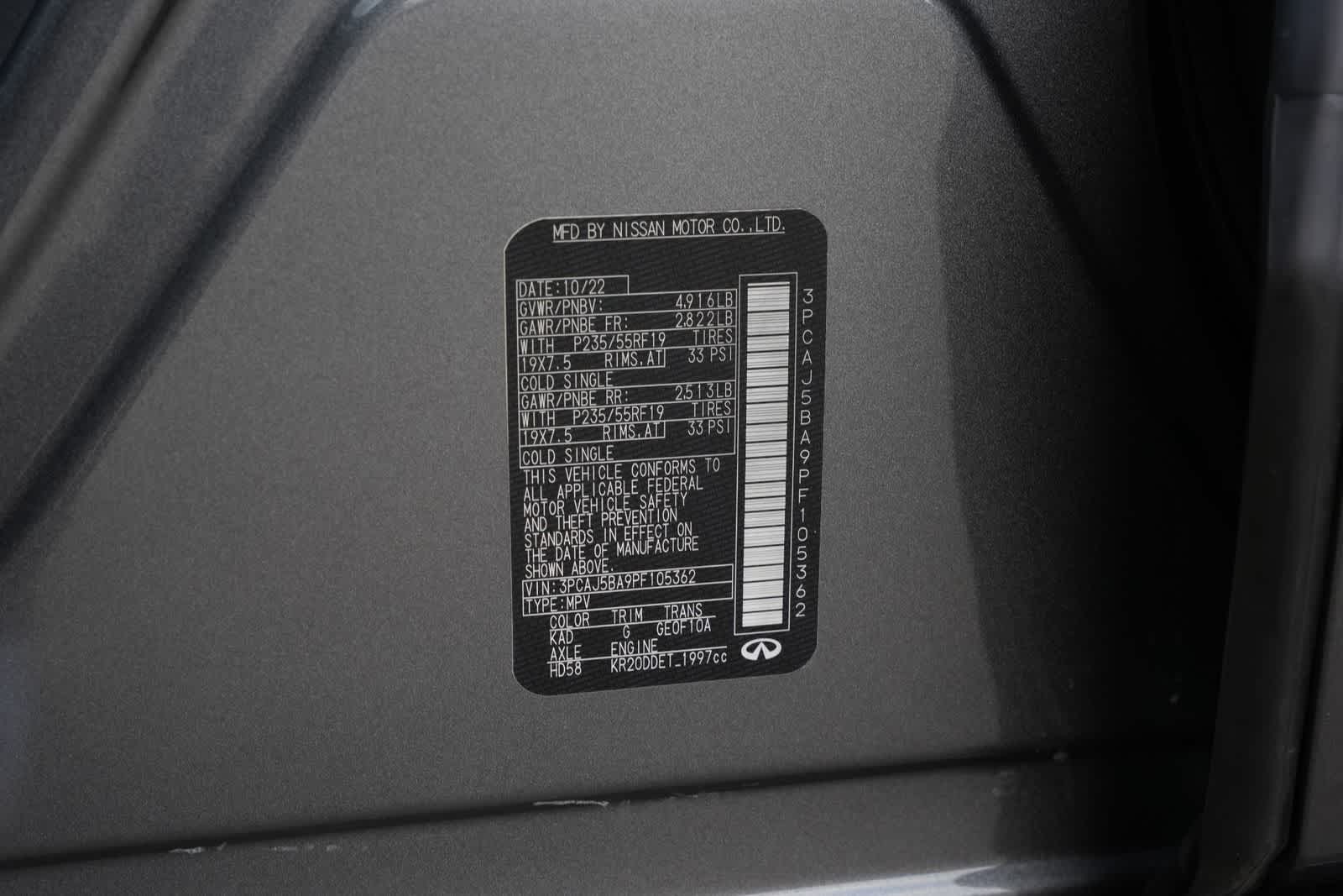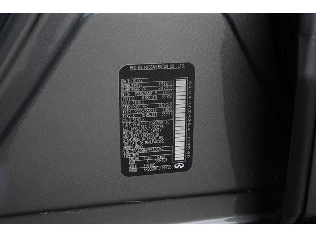 4-Wheel Disc Brakes, 5.846 Axle Ratio, 6 Speakers, ABS brakes, Air Conditioning, Alloy wheels, Aluminum Interior Accents, AM/FM radio: SiriusXM, Auto High-beam Headlights, Auto-dimming Rear-View mirror, Automatic temperature control, Bose 12-Speaker Premium Audio, Brake assist, Bumpers: body-color, CD player, Delay-off headlights, Driver door bin, Driver vanity mirror, Dual front impact airbags, Dual front side impact airbags, Electronic Stability Control, Emergency communication system: INFINITI InTouch (1-year complimentary trial), Exterior Parking Camera Rear, Floor Mats, Four wheel independent suspension, Front anti-roll bar, Front Bucket Seats, Front Center Armrest, Front dual zone A/C, Front reading lights, Fully automatic headlights, Garage door transmitter: HomeLink, Heated door mirrors, Heated Front Bucket Seats, Heated front seats, Illuminated entry, Illuminated Kick Plates, Knee airbag, Leather Shift Knob, Leather steering wheel, Leather-Appointed Seat Trim, Literature Kit, Low tire pressure warning, Memory seat, Occupant sensing airbag, Outside temperature display, Overhead airbag, Overhead console, Panic alarm, Passenger door bin, Passenger vanity mirror, Power door mirrors, Power driver seat, Power Liftgate, Power moonroof, Power passenger seat, Power steering, Power windows, Radio data system, Radio: HD Audio System, Rear anti-roll bar, Rear Parking Sensors, Rear reading lights, Rear seat center armrest, Rear side impact airbag, Rear window defroster, Rear window wiper, Remote keyless entry, Security system, Speed control, Speed-sensing steering, Speed-Sensitive Wipers, Splash Guards (Set of 4), Split folding rear seat, Spoiler, Steering wheel mounted audio controls, Tachometer, Telescoping steering wheel, Tilt steering wheel, Traction control, Trip computer, Turn signal indicator mirrors, Variably intermittent wipers, Wheels: 19 Silver Painted Aluminum Alloy.