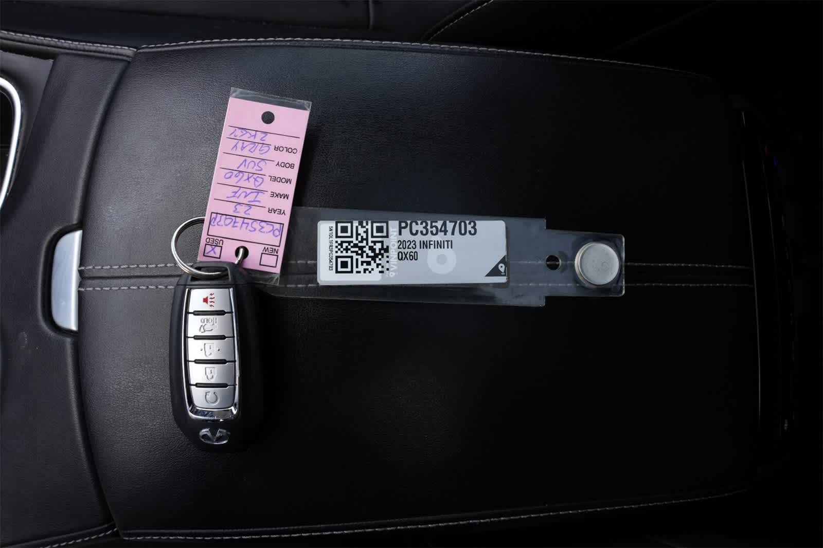 3rd row seats: bench, 4-Wheel Disc Brakes, 4.334 Axle Ratio, 9 Speakers, ABS brakes, Air Conditioning, Alloy wheels, AM/FM radio: SiriusXM, Anti-whiplash front head restraints, Auto High-beam Headlights, Auto-dimming door mirrors, Auto-dimming Rear-View mirror, Automatic temperature control, Brake assist, Bumpers: body-color, Climate-Controlled Front Bucket Seats, Delay-off headlights, Driver door bin, Driver vanity mirror, Dual front impact airbags, Dual front side impact airbags, Electronic Stability Control, Emergency communication system, Floor Mats on Bench Seats w/3rd Row Tray, Four wheel independent suspension, Front anti-roll bar, Front Bucket Seats, Front Center Armrest, Front dual zone A/C, Front reading lights, Fully automatic headlights, Garage door transmitter: HomeLink, Heated door mirrors, Heated front seats, Heated steering wheel, Illuminated entry, Knee airbag, Leather Shift Knob, Leather steering wheel, Leather-Appointed Seating Surfaces, Literature Kit, Low tire pressure warning, Memory seat, Navigation system: INFINITI InTouch Navigation, Occupant sensing airbag, Outside temperature display, Overhead airbag, Overhead console, Panic alarm, Passenger door bin, Passenger vanity mirror, Power door mirrors, Power driver seat, Power Liftgate, Power moonroof, Power passenger seat, Power steering, Power windows, Radio data system, Radio: AM/FM Audio System, Rain sensing wipers, Rear air conditioning, Rear anti-roll bar, Rear reading lights, Rear seat center armrest, Rear side impact airbag, Rear window defroster, Rear window wiper, Reclining 3rd row seat, Remote keyless entry, Security system, Speed control, Speed-sensing steering, Speed-Sensitive Wipers, Splash Guards, Split folding rear seat, Spoiler, Steering wheel memory, Steering wheel mounted audio controls, Tachometer, Telescoping steering wheel, Tilt steering wheel, Traction control, Trip computer, Turn signal indicator mirrors, Variably intermittent wipers, Ventilated front seats, Wheels: 20 x 8J Sporty Machined Aluminum Alloy.