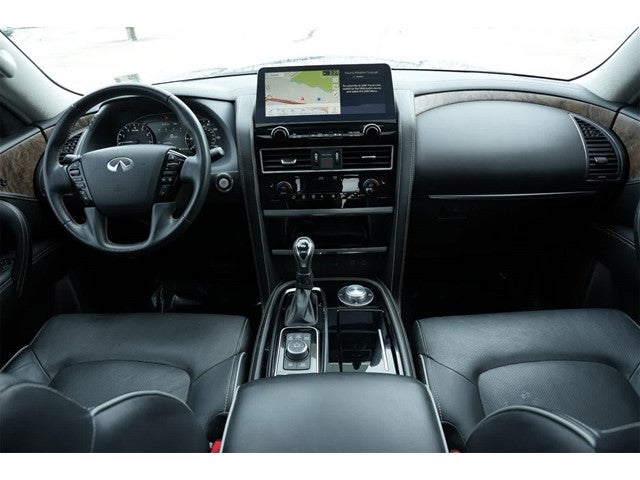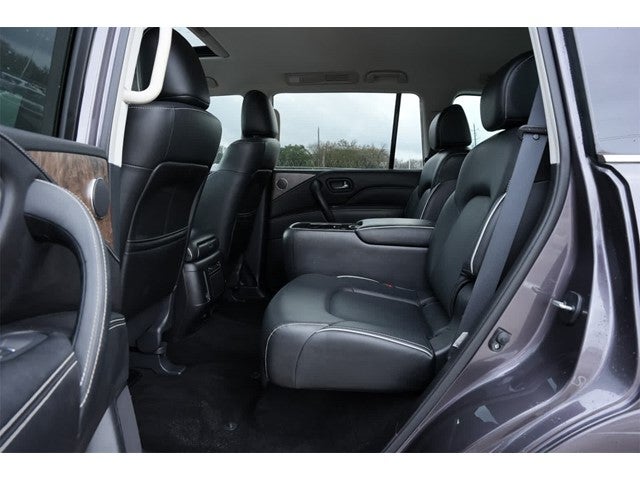 13 Speakers, 2.937 Axle Ratio, 3rd row seats: split-bench, 4-Wheel Disc Brakes, ABS brakes, Air Conditioning, Alloy wheels, AM/FM radio: SiriusXM, Anti-whiplash front head restraints, Auto High-beam Headlights, Auto tilt-away steering wheel, Auto-dimming door mirrors, Auto-dimming Rear-View mirror, Auto-leveling suspension, Automatic temperature control, Brake assist, Bumpers: body-color, Cargo Net, Cargo Package, Carpeted Cargo Mat, Center Console Tray, Compass, Console Net, Delay-off headlights, Driver door bin, Driver vanity mirror, Dual front impact airbags, Dual front side impact airbags, Electronic Stability Control, Emergency communication system: INFINITI InTouch, First-Aid Kit, Four wheel independent suspension, Front anti-roll bar, Front Bucket Seats, Front Center Armrest, Front dual zone A/C, Front fog lights, Front reading lights, Fully automatic headlights, Garage door transmitter: HomeLink, Heated door mirrors, Heated Front Bucket Seats, Heated front seats, Heated steering wheel, Illuminated entry, INFINITI Radiant Illuminated Kick Plates, Leather Shift Knob, Leather steering wheel, Leather-Appointed Seats, Literature Kit, Low tire pressure warning, Memory seat, Midyear Change, Navigation system: INFINITI InTouch Navigation, Occupant sensing airbag, Outside temperature display, Overhead airbag, Overhead console, Panic alarm, Passenger door bin, Passenger vanity mirror, Power door mirrors, Power driver seat, Power Liftgate, Power moonroof, Power passenger seat, Power steering, Power windows, Premium audio system: Bose, Premium Select Graphite Interior, Radio data system, Radio: Bose Premium Audio System w/13 Speakers, Rain sensing wipers, Rear air conditioning, Rear anti-roll bar, Rear reading lights, Rear seat center armrest, Rear window defroster, Rear window wiper, Reclining 3rd row seat, Remote keyless entry, Roof Rail Cross Bars, Security system, Speed control, Speed-sensing steering, Split folding rear seat, Spoiler, Steering wheel memory, Steering wheel mounted audio controls, Tachometer, Telescoping steering wheel, Tilt steering wheel, Traction control, Trip computer, Turn signal indicator mirrors, Variably intermittent wipers, Voltmeter, Wheels: 22 x 8.0 Dark Chrome Cast Aluminum-Alloy.