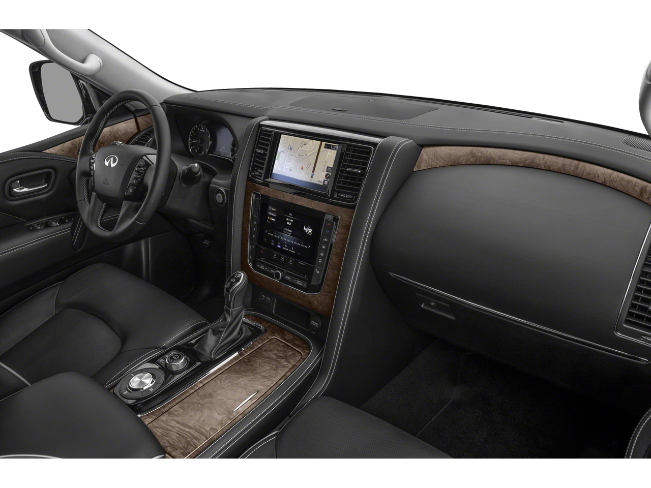13 Speakers, 2.937 Axle Ratio, 3rd row seats: bench, 4-Wheel Disc Brakes, ABS brakes, Air Conditioning, Alloy wheels, AM/FM radio: SiriusXM, Anti-whiplash front head restraints, Apple CarPlay/Android Auto, Auto High-beam Headlights, Auto tilt-away steering wheel, Auto-dimming door mirrors, Auto-dimming Rear-View mirror, Auto-leveling suspension, Automatic temperature control, Brake assist, Bumpers: body-color, Cargo Package, Compass, Console Net, Delay-off headlights, Driver door bin, Driver vanity mirror, Dual front impact airbags, Dual front side impact airbags, Electronic Stability Control, Emergency communication system: INFINITI InTouch, First-Aid Kit, Four wheel independent suspension, Front anti-roll bar, Front Bucket Seats, Front Center Armrest, Front dual zone A/C, Front fog lights, Front reading lights, Fully automatic headlights, Garage door transmitter: HomeLink, Heated door mirrors, Heated Front Bucket Seats, Heated front seats, Heated steering wheel, Illuminated entry, Leather Shift Knob, Leather steering wheel, Leather-Appointed Seats, Literature Kit, Low tire pressure warning, Memory seat, Moisture-Resistant Rear Cargo Carpet, Navigation system: INFINITI InTouch Navigation, Nylon-Cord Cargo Net, Occupant sensing airbag, Outside temperature display, Overhead airbag, Overhead console, Panic alarm, Passenger door bin, Passenger vanity mirror, Power door mirrors, Power driver seat, Power Liftgate, Power moonroof, Power passenger seat, Power steering, Power windows, Premium Select Graphite Interior, Radio data system, Radio: Bose Premium Audio System w/13 Speakers, Rain sensing wipers, Rear air conditioning, Rear anti-roll bar, Rear reading lights, Rear seat center armrest, Rear window defroster, Rear window wiper, Reclining 3rd row seat, Remote keyless entry, Roof Rail Cross Bars, Security system, Speed control, Speed-sensing steering, Split Bench Seat Package, Split folding rear seat, Spoiler, Steering wheel memory, Steering wheel mounted audio controls, Tachometer, Telescoping steering wheel, Tilt steering wheel, Traction control, Trip computer, Turn signal indicator mirrors, Variably intermittent wipers, Voltmeter, Wheels: 22 Dark Chrome Cast Aluminum-Alloy.