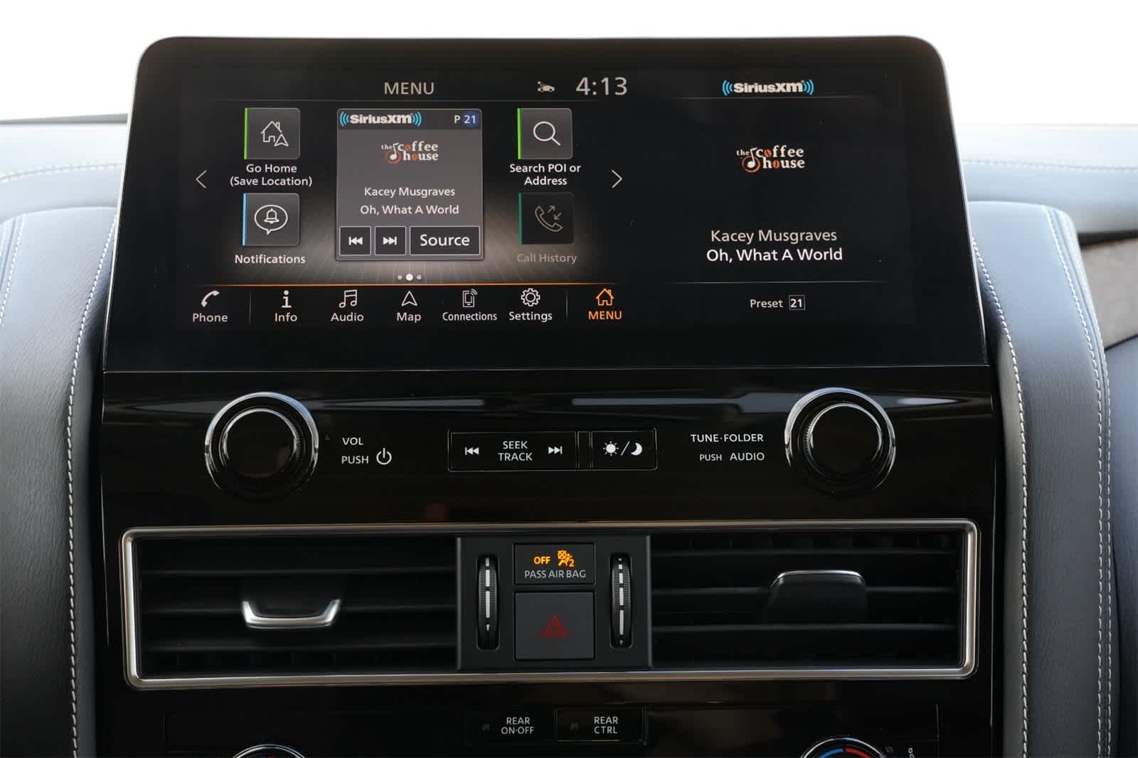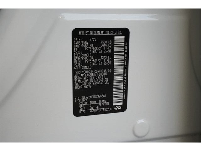 INFINITI Certified Pre-Owned Certified, 13 Speakers, 2.937 Axle Ratio, 3rd row seats: bench, 4-Wheel Disc Brakes, ABS brakes, Air Conditioning, Alloy wheels, AM/FM radio: SiriusXM, Anti-whiplash front head restraints, Apple CarPlay/Android Auto, Auto High-beam Headlights, Auto tilt-away steering wheel, Auto-dimming door mirrors, Auto-dimming Rear-View mirror, Auto-leveling suspension, Automatic temperature control, Brake assist, Bumpers: body-color, Cargo Package, Compass, Console Net, Delay-off headlights, Driver door bin, Driver vanity mirror, Dual front impact airbags, Dual front side impact airbags, Electronic Stability Control, Emergency communication system: INFINITI InTouch, First-Aid Kit, Four wheel independent suspension, Front anti-roll bar, Front Bucket Seats, Front Center Armrest, Front dual zone A/C, Front fog lights, Front reading lights, Fully automatic headlights, Garage door transmitter: HomeLink, Heated door mirrors, Heated Front Bucket Seats, Heated front seats, Heated steering wheel, Illuminated entry, Leather Shift Knob, Leather steering wheel, Leather-Appointed Seats, Literature Kit, Low tire pressure warning, Memory seat, Moisture-Resistant Rear Cargo Carpet, Navigation system: INFINITI InTouch Navigation, Nylon-Cord Cargo Net, Occupant sensing airbag, Outside temperature display, Overhead airbag, Overhead console, Panic alarm, Passenger door bin, Passenger vanity mirror, Power door mirrors, Power driver seat, Power Liftgate, Power moonroof, Power passenger seat, Power steering, Power windows, Premium Select Truffle Brown Interior, Radio data system, Radio: Bose Premium Audio System w/13 Speakers, Rain sensing wipers, Rear air conditioning, Rear anti-roll bar, Rear reading lights, Rear seat center armrest, Rear window defroster, Rear window wiper, Reclining 3rd row seat, Remote keyless entry, Roof Rail Cross Bars, Security system, Speed control, Speed-sensing steering, Split folding rear seat, Spoiler, Steering wheel memory, Steering wheel mounted audio controls, Tachometer, Telescoping steering wheel, Tilt steering wheel, Traction control, Trip computer, Turn signal indicator mirrors, Variably intermittent wipers, Voltmeter, Wheels: 22 Dark Chrome Cast Aluminum-Alloy.