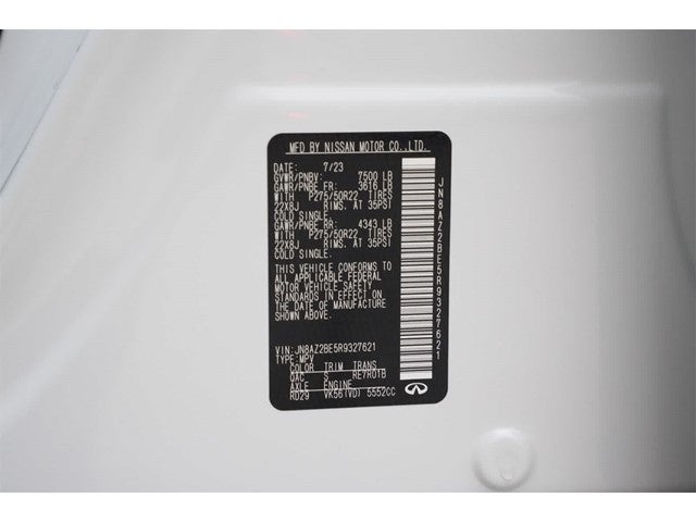 INFINITI Certified Pre-Owned Certified, 17 Speakers, 2.937 Axle Ratio, 3rd row seats: bench, 4-Wheel Disc Brakes, ABS brakes, Air Conditioning, Alloy wheels, AM/FM radio: SiriusXM, Anti-whiplash front head restraints, Apple CarPlay/Android Auto, Auto High-beam Headlights, Auto tilt-away steering wheel, Auto-dimming door mirrors, Auto-dimming Rear-View mirror, Auto-leveling suspension, Automatic temperature control, Brake assist, Bumpers: body-color, Cargo Package, Climate Controlled Front Bucket Seats, Compass, Console Net, Delay-off headlights, Driver door bin, Driver vanity mirror, Dual front impact airbags, Dual front side impact airbags, Electronic Stability Control, Emergency communication system: INFINITI InTouch, First-Aid Kit, Four wheel independent suspension, Front anti-roll bar, Front Bucket Seats, Front Center Armrest, Front dual zone A/C, Front fog lights, Front reading lights, Fully automatic headlights, Garage door transmitter: HomeLink, Heated door mirrors, Heated front seats, Heated rear seats, Heated steering wheel, Illuminated entry, Leather Shift Knob, Leather steering wheel, Literature Kit, Low tire pressure warning, Memory seat, Moisture-Resistant Rear Cargo Carpet, Navigation system: INFINITI InTouch Navigation, Nylon-Cord Cargo Net, Occupant sensing airbag, Outside temperature display, Overhead airbag, Overhead console, Panic alarm, Passenger door bin, Passenger vanity mirror, Perforated Semi-Aniline Leather-Appointed Seats, Power door mirrors, Power driver seat, Power Liftgate, Power moonroof, Power passenger seat, Power steering, Power windows, Radio data system, Radio: Bose Performance Audio System w/17 Speakers, Rain sensing wipers, Rear air conditioning, Rear anti-roll bar, Rear reading lights, Rear seat center armrest, Rear window defroster, Rear window wiper, Reclining 3rd row seat, Remote keyless entry, Roof Rail Cross Bars, Security system, Speed control, Speed-sensing steering, Split folding rear seat, Spoiler, Steering wheel memory, Steering wheel mounted audio controls, Tachometer, Telescoping steering wheel, Tilt steering wheel, Traction control, Trip computer, Turn signal indicator mirrors, Variably intermittent wipers, Ventilated front seats, Voltmeter, Wheels: 22 Dark Chrome Cast Aluminum-Alloy.