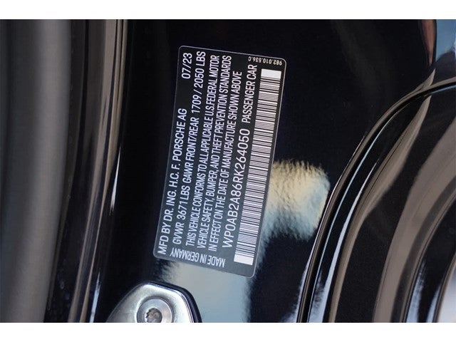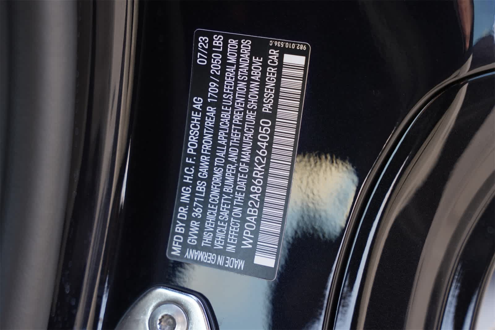 2-Way Sport Seats, 4-Wheel Disc Brakes, 8 Speakers, ABS brakes, Air Conditioning, Alloy wheels, AM/FM radio: SiriusXM, Apple CarPlay, Auto-dimming door mirrors, Auto-dimming Rear-View mirror, Automatic temperature control, Brake assist, Bumpers: body-color, Delay-off headlights, Driver door bin, Driver vanity mirror, Dual front impact airbags, Dual front side impact airbags, Electronic Stability Control, Exterior Parking Camera Rear, Four wheel independent suspension, Front anti-roll bar, Front Bucket Seats, Front Center Armrest, Front dual zone A/C, Front reading lights, Fully automatic headlights, Garage door transmitter: HomeLink, Headlight cleaning, Heated door mirrors, Heated front seats, Heated Seats, High intensity discharge headlights: Bi-Xenon, Illuminated entry, Knee airbag, Leather Shift Knob, Low tire pressure warning, Occupant sensing airbag, Outside temperature display, Overhead airbag, Partial Leather Seat Trim, Passenger door bin, Passenger vanity mirror, Porsche Communication Management, Power door mirrors, Power driver seat, Power passenger seat, Power steering, Power windows, Radio data system, Rain sensing wipers, Rear anti-roll bar, Rear window defroster, Remote keyless entry, Security system, Sound Package Plus w/8 Loudspeakers, Speed control, Spoiler, Sport steering wheel, Tachometer, Telescoping steering wheel, Tilt steering wheel, Traction control, Trip computer, Variably intermittent wipers, Wheels: 19 Boxster S.