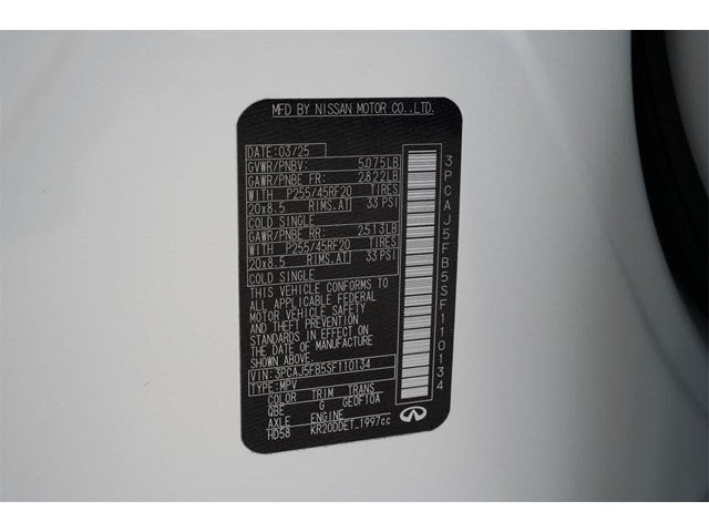 INFINITI Certified Pre-Owned Certified, 12 Speakers, 4-Wheel Disc Brakes, ABS brakes, Air Conditioning, Alloy wheels, AM/FM radio: SiriusXM, Auto High-beam Headlights, Auto-dimming Rear-View mirror, Automatic temperature control, Bose Premium Audio System, Brake assist, Bumpers: body-color, CD player, Climate Controlled Front Bucket Seats, Delay-off headlights, Driver door bin, Driver vanity mirror, Dual front impact airbags, Dual front side impact airbags, Electronic Stability Control, Emergency communication system: INFINITI InTouch (1-year complimentary trial), Exterior Parking Camera Rear, Four wheel independent suspension, Front anti-roll bar, Front Bucket Seats, Front Center Armrest, Front dual zone A/C, Front fog lights, Front reading lights, Fully automatic headlights, Garage door transmitter: HomeLink, Heated door mirrors, Heated front seats, Heated steering wheel, Illuminated entry, Knee airbag, Leather Shift Knob, Leather steering wheel, Low tire pressure warning, Memory seat, Navigation system: INFINITI InTouch Navigation, Occupant sensing airbag, Outside temperature display, Overhead airbag, Overhead console, Panic alarm, Passenger door bin, Passenger vanity mirror, Power door mirrors, Power driver seat, Power Liftgate, Power moonroof, Power passenger seat, Power steering, Power windows, Radio data system, Rear anti-roll bar, Rear reading lights, Rear seat center armrest, Rear side impact airbag, Rear window defroster, Rear window wiper, Remote keyless entry, Security system, Semi-Aniline Leather-Appointed Seat Trim, Speed control, Speed-sensing steering, Speed-Sensitive Wipers, Split folding rear seat, Spoiler, Steering wheel mounted audio controls, Tachometer, Telescoping steering wheel, Tilt steering wheel, Traction control, Trip computer, Turn signal indicator mirrors, Variably intermittent wipers, Ventilated front seats, Wheels: 20 Dark-Painted Machine-Finished Alloy.